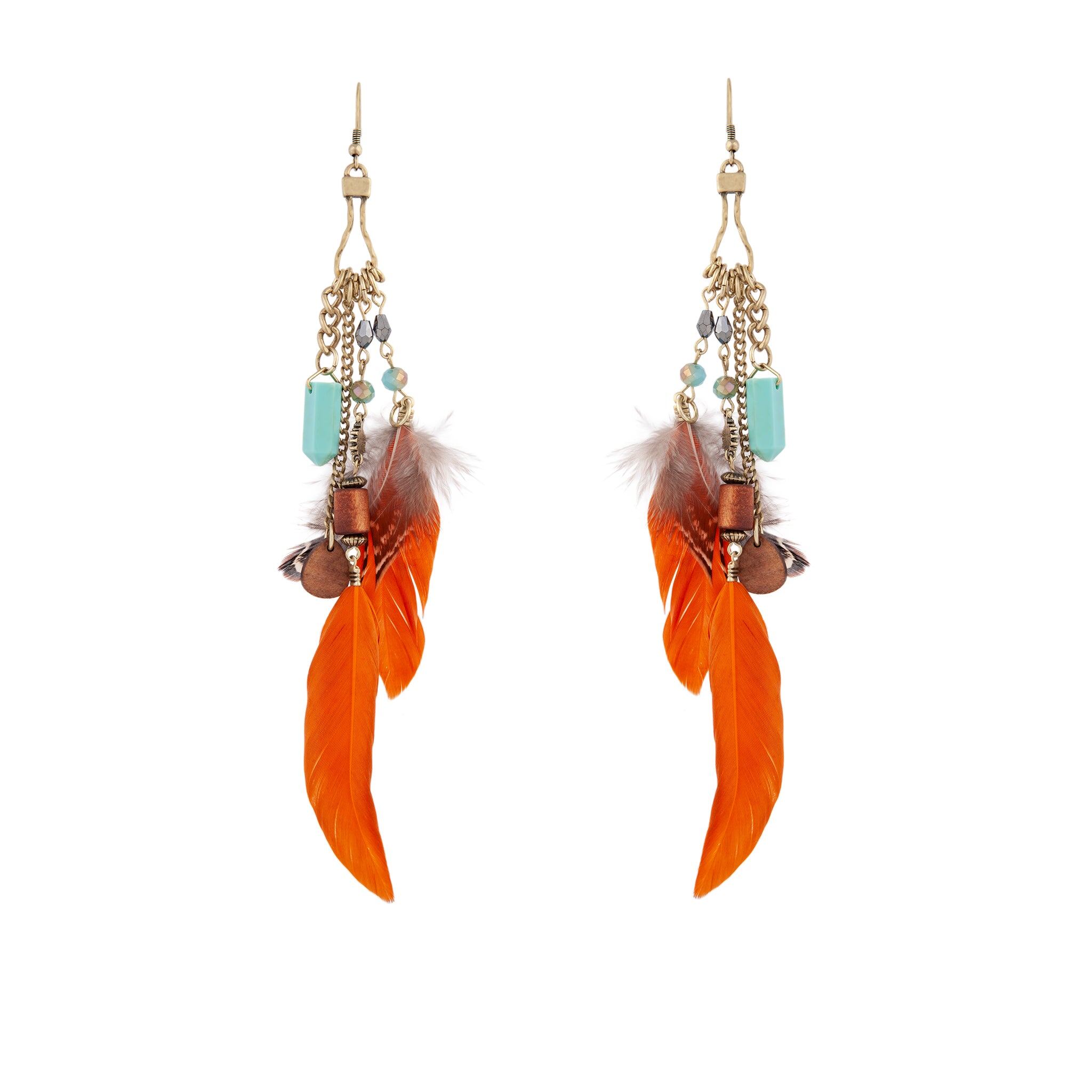 Material: Feathers. BeadsColour: Orange / Terracotta. Blue / Turquoise. BrownStyle: Wear with semi-precious gems and woven accessories.Occasion: Outdoor events amongst natureCare: For best results. avoid direct contact with water. moisturiser and perfume. For hygiene reasons. earrings cannot be returned.Size: Earring length is 165mm and measures 15mm at it's widest point.Weight: Single earring weighs 11.75g