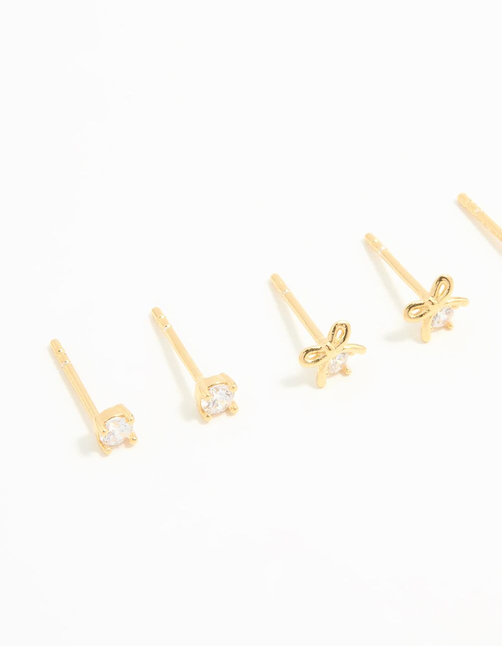 Upgrade your accessory game with the Gold Plated Sterling Silver Bow & Sleek Earrings 3-Pack! This set includes bow studs. diamante studs. and minimalistic gold studs. Crafted from gold plated sterling silver. they're perfect for everyday wear.