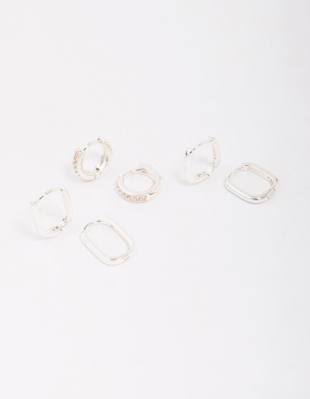 Create the stack of your dreams with this set of silver plated brass hoops. This earring pack includes three sets of geometric huggies. perfect for layering together in your daily rotation.