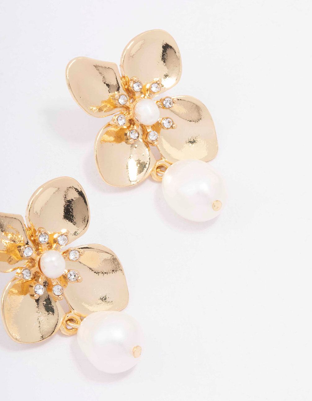 Gold Plated Crystal Flower Pearl Drop Earrings