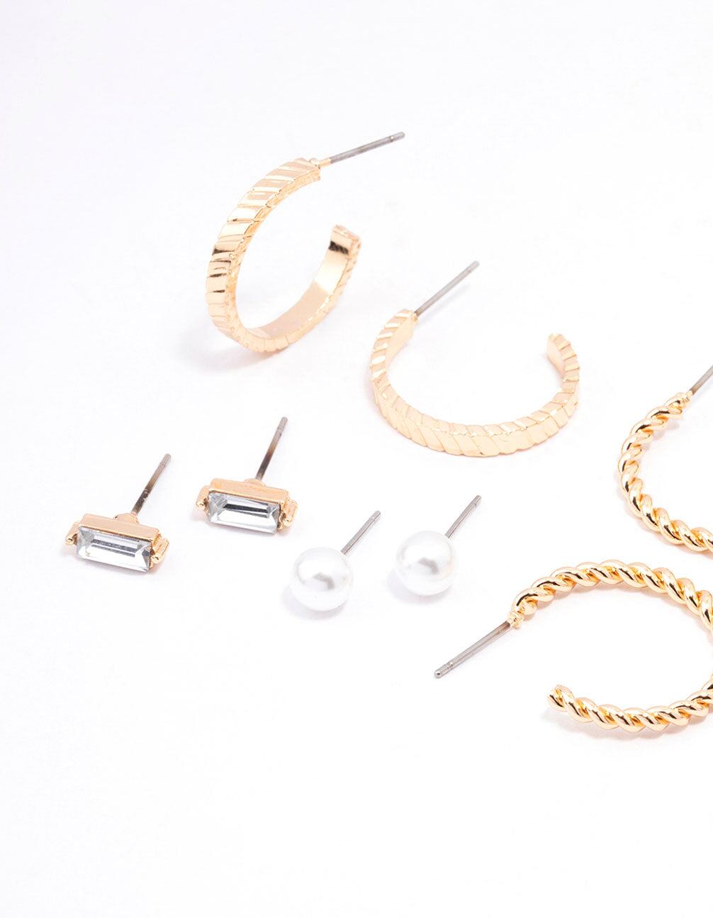 This set of eight. gold-toned stud and hoop earrings contains a mix of textured and simple styles for a modern feel.