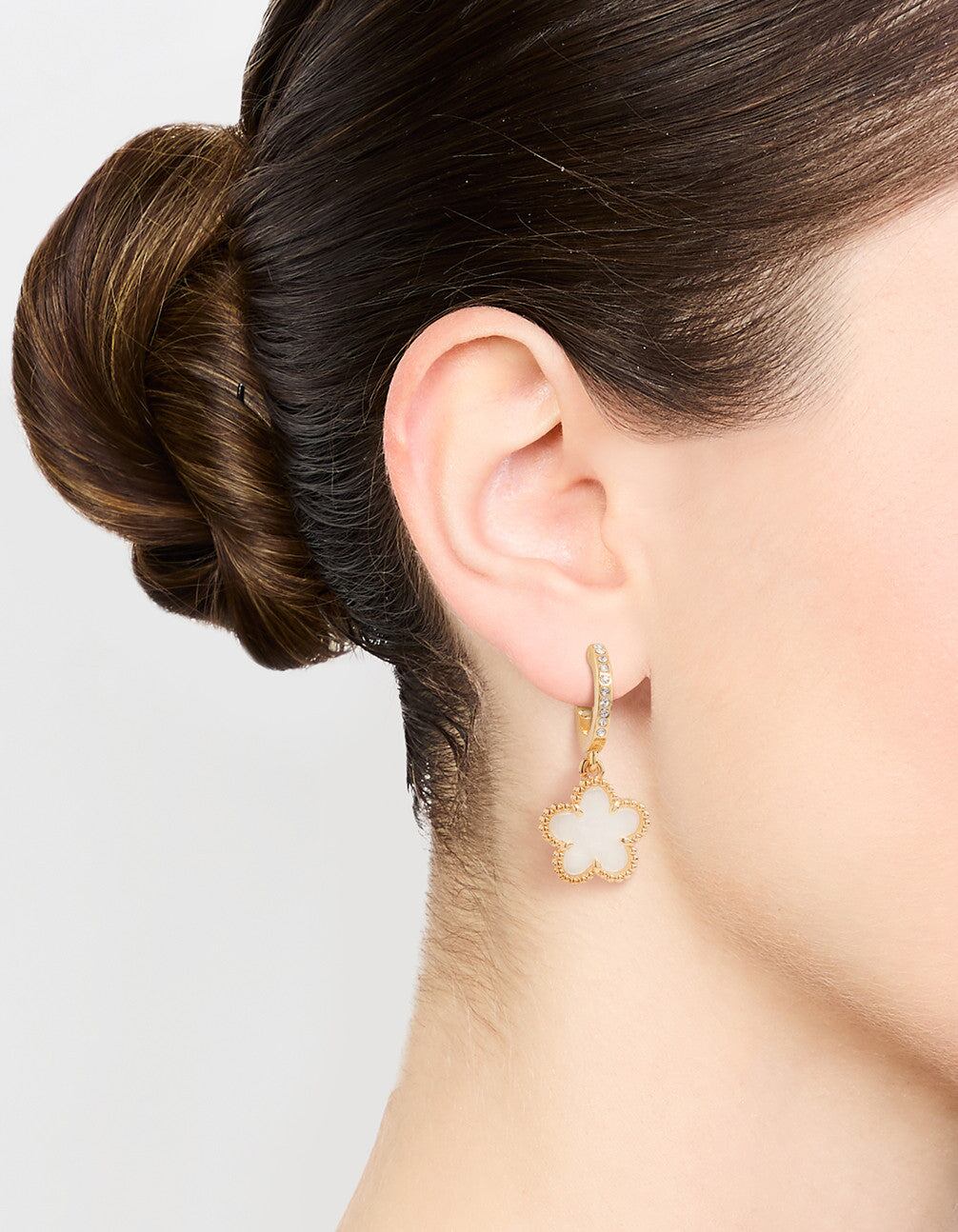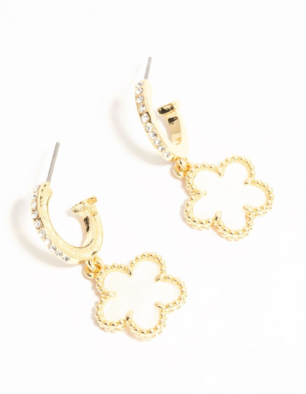 Add some floral flair with these hoop earrings! Featuring gold plating. diamante-encrusted hoops. and pretty white flowers. they're perfect for a chic. floral look.