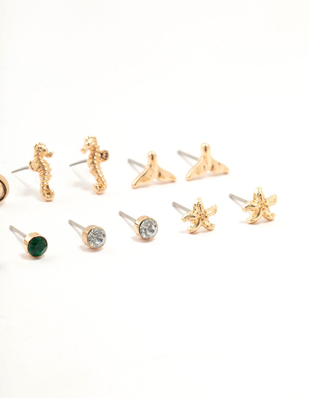Calling all animal lovers! This set of 12 gold-toned earrings showcases a variety of sea creature designs. Ideal for ocean enthusiasts. this collection adds a touch of simplicity and charm to any look.