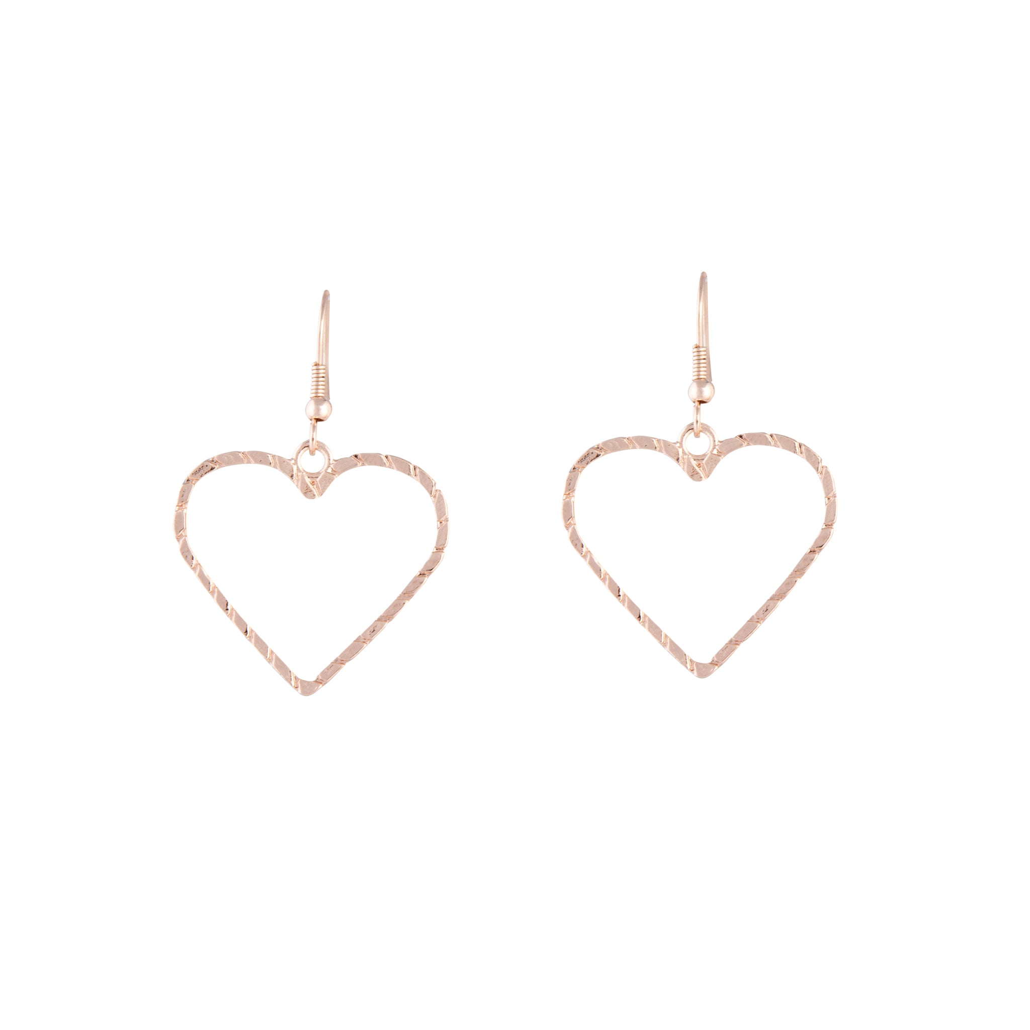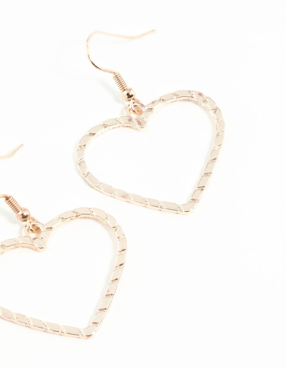 A minimal pair of heart shaped earrings with a diamond cut finish in a rose gold tone.