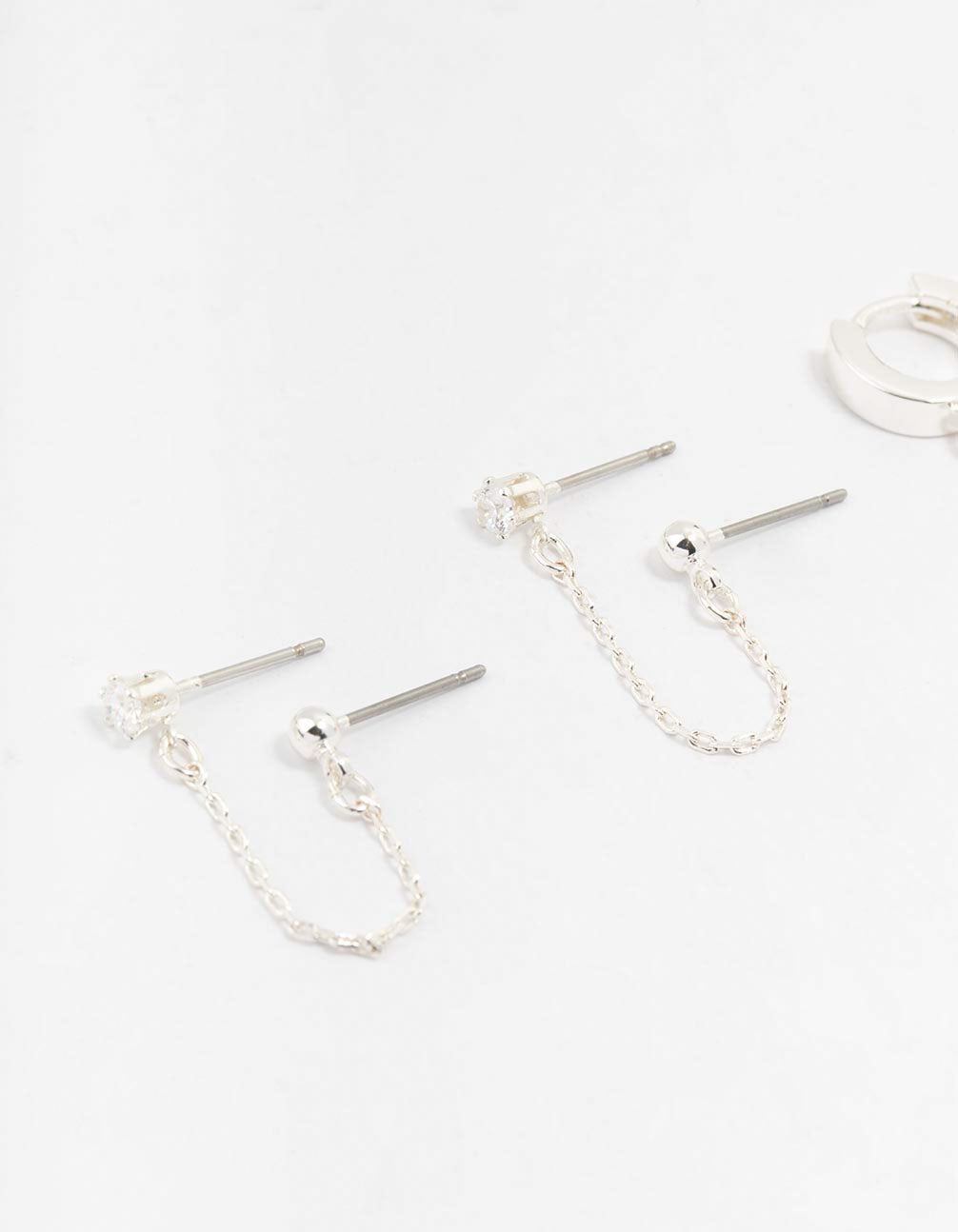 These earring stack set features three pairs of sterling silver chain stud and hoop earrings - perfect for layering. The earrings feature sparkling cubic zirconia stones in dainty sterling silver settings. providing a beautiful. eye-catching look.