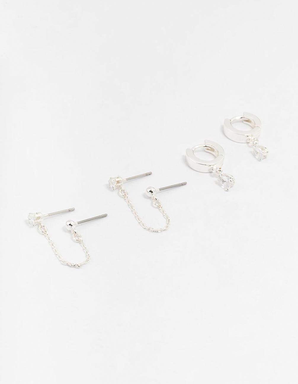Silver Cubic Zirconia Chain Stud & Hoop Earrings 3-Pack