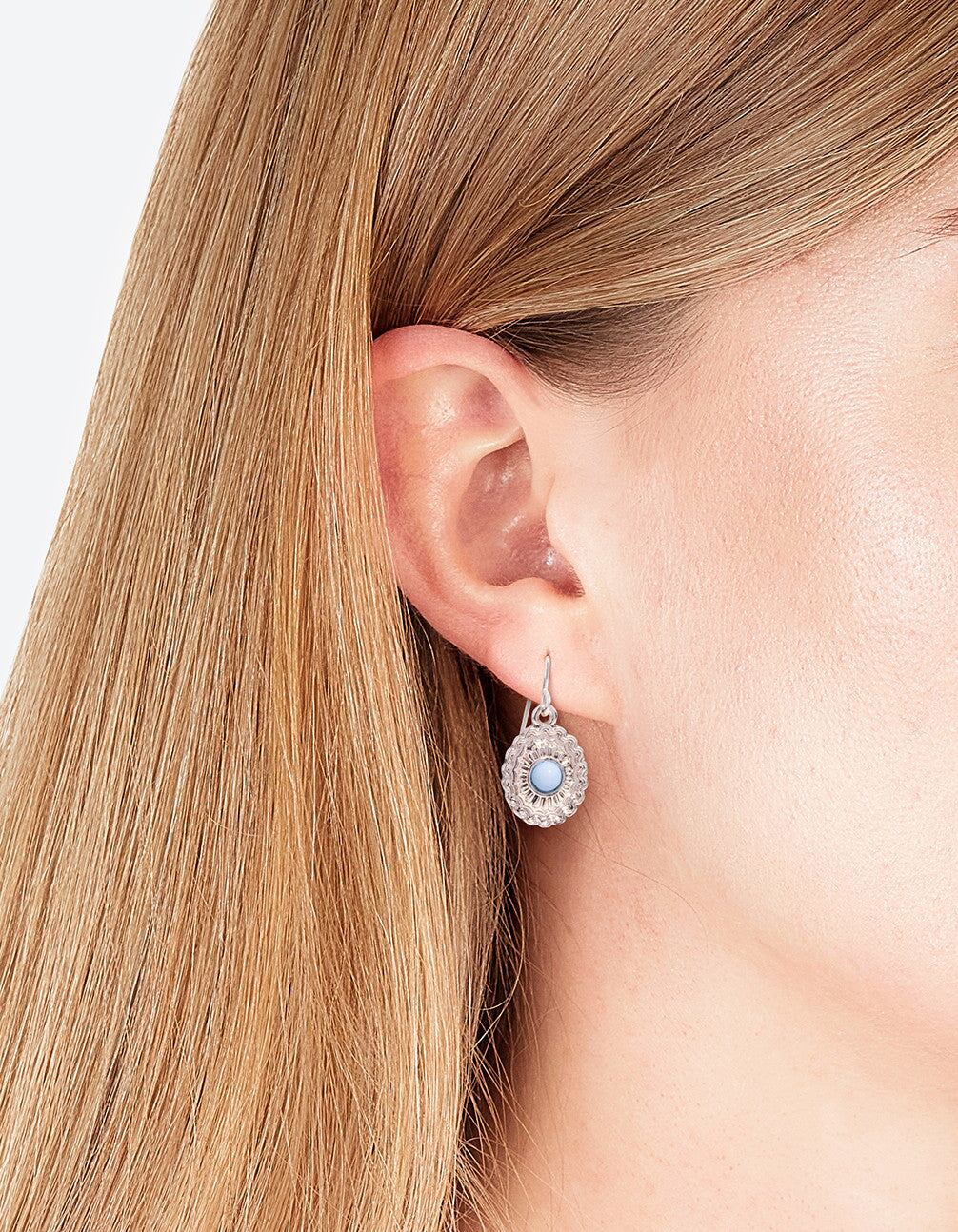 A faux opal centre stone. finished with an antique silver toned floral border.