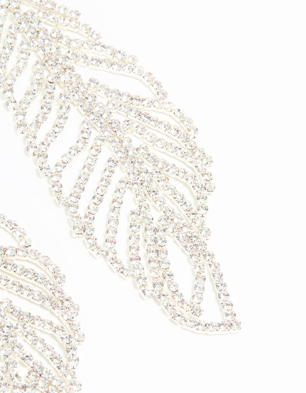 Silver Diamante Leaf Outline Hook Large Drop Earrings