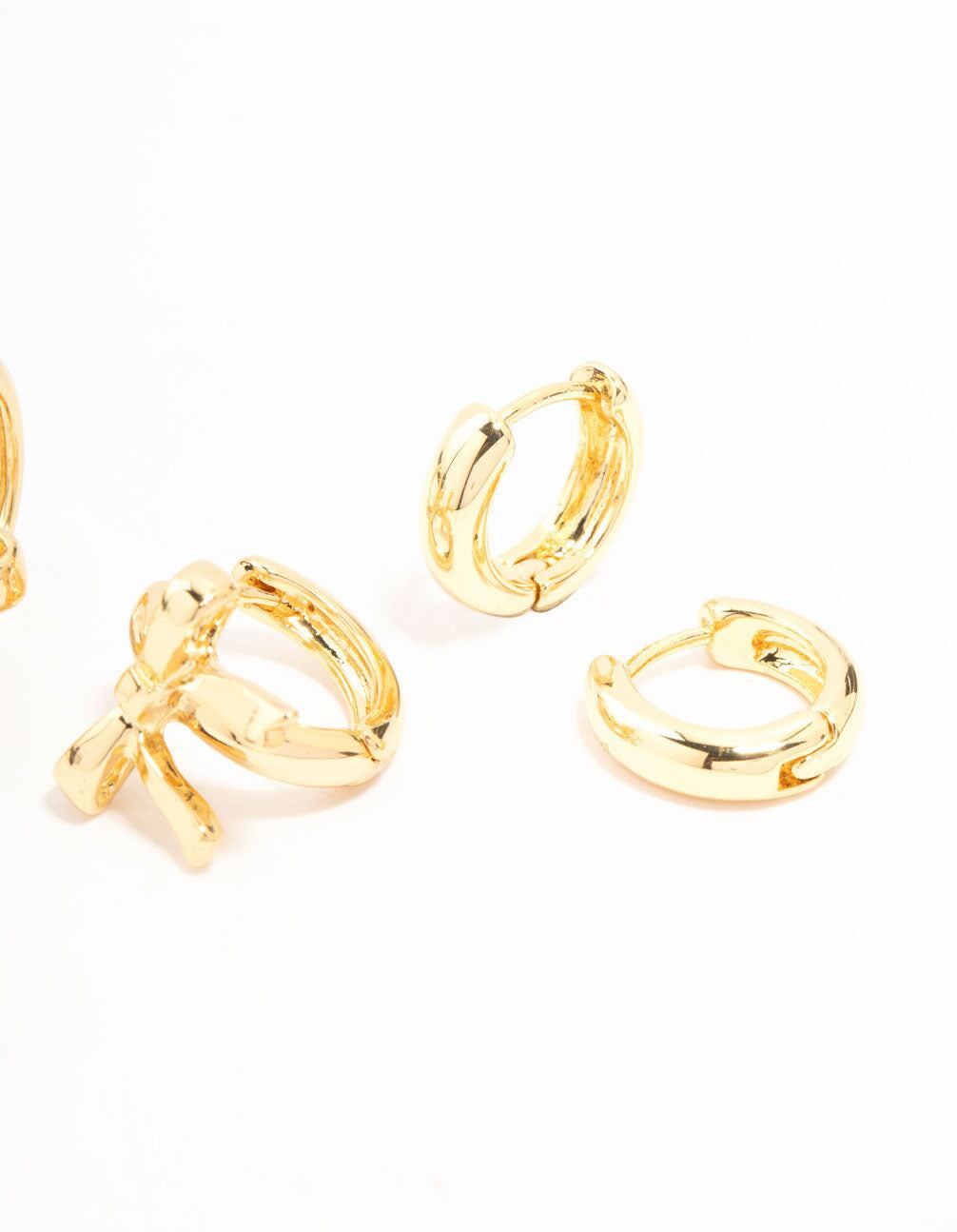 Gold Plated Brass Bow Drop & Cubic Zirconia Huggie & Stud Earrings 3-Pack