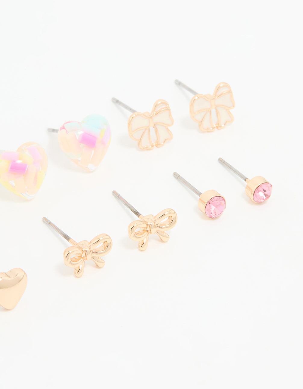 Complete your jewellery collection with this Gold Bow & Heart Stud Earrings Pack. the ultimate set for mixing and matching your style. Featuring a playful variety of designs?think pink diamante heart studs. pearl studs. sleek gold heart studs. delicate bow studs. and even double bow studs?this pack has something for every vibe. Perfect for adding a pop of sparkle or a touch of charm. these stud earrings are your go-to for any occasion. from casual brunches to date nights. Pair them with a floaty dress for a sweet. feminine look or add them to your everyday jeans-and-tee combo for an instant style upgrade. With gold tones. pearls. and shimmering diamantes. this versatile set is all about effortless chic.