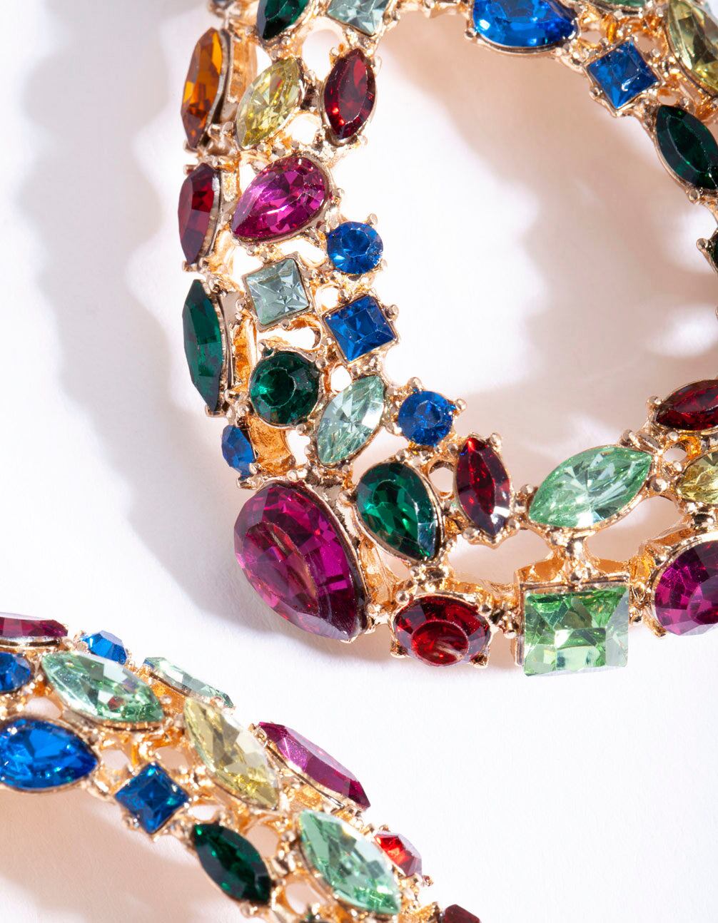 Turn heads with a pair of statement earrings! These drop earrings boast a teardrop rainbow cluster design in a gold-tone setting