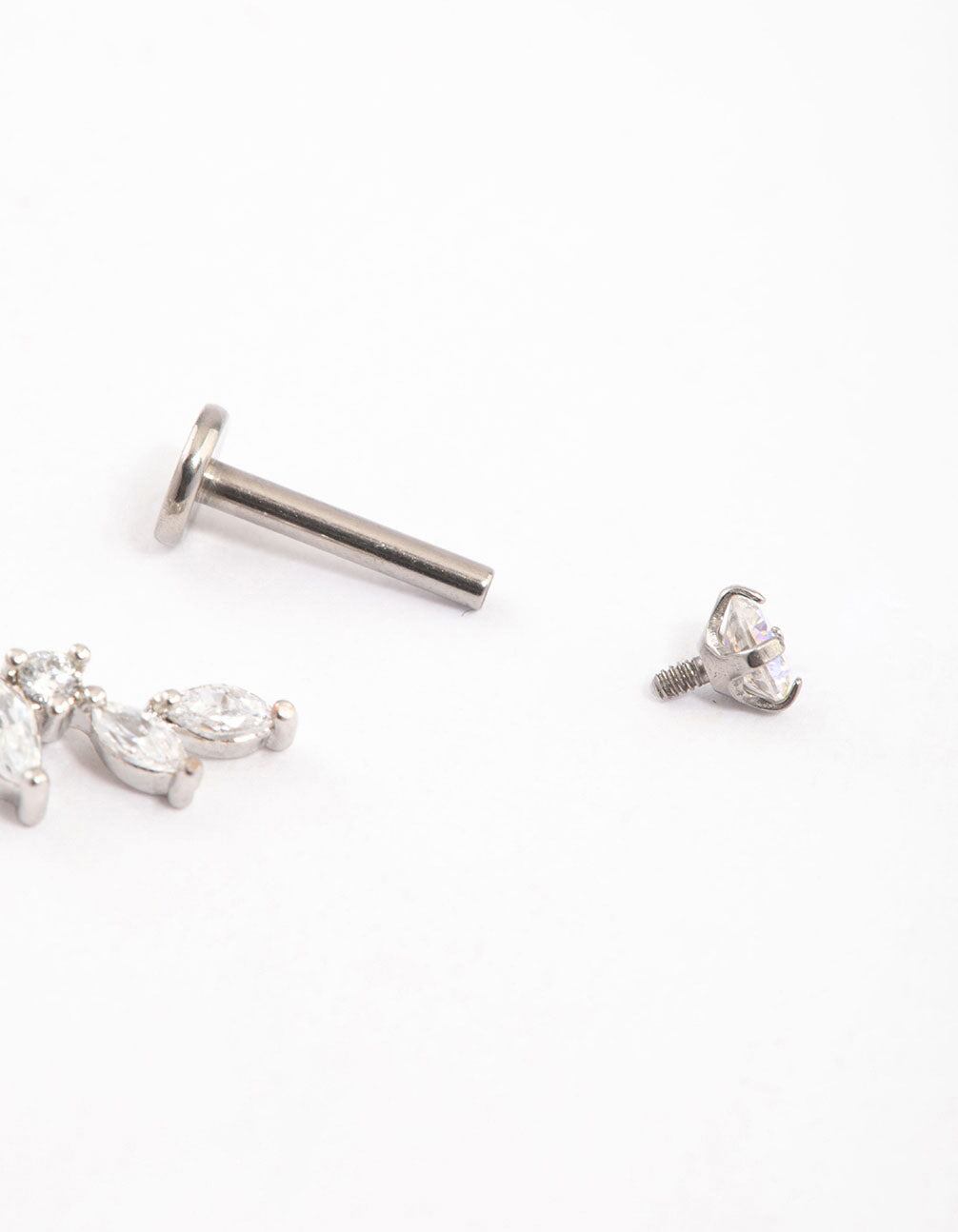 Material: Cubic Zirconia. Gold Plated. TitaniumColour: SilverDimensions: Post Length: 8 mmGauge: 16 g / 1.2 mmThis Gold Plated Titanium Cubic Zirconia Marquise Leaf Flat Back Pack contains three individual flatbacks. designed with cubic zirconia crystals to form a leaf motif.Product InformationMaterial: TitaniumFeature: Leaf Motif & Cubic Zirconia CrystalsStyle: FlatbackContents: Pack Contains 3 Individual FlatbacksWeight: 15.2gSuitable for these piercing placements: