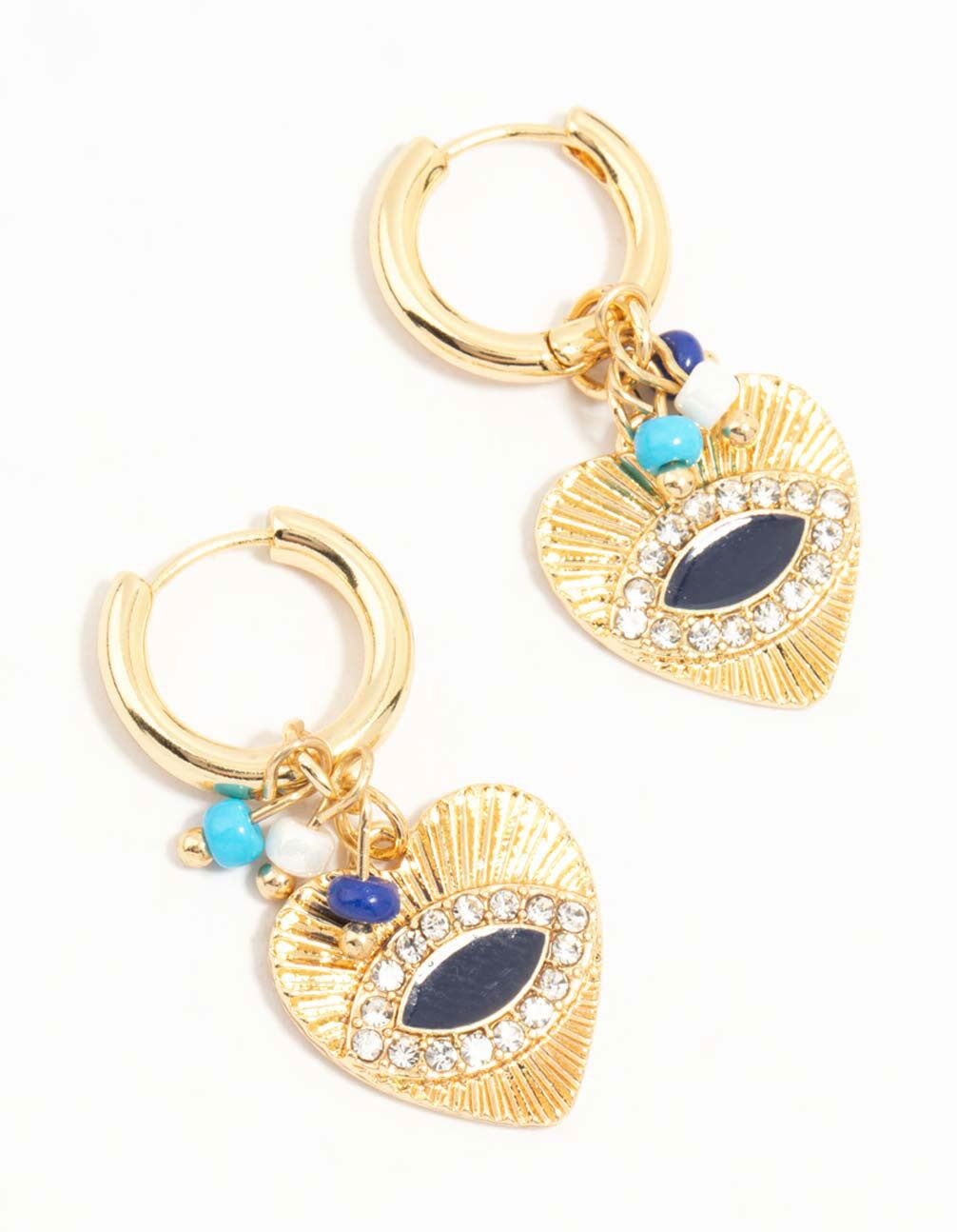 Say goodbye to bad vibes with these gold-plated charm earrings! Featuring an evil eye design. blue and white beads. and diamante accents. they're perfect for protecting your energy and adding a stylish. protective touch to any look.