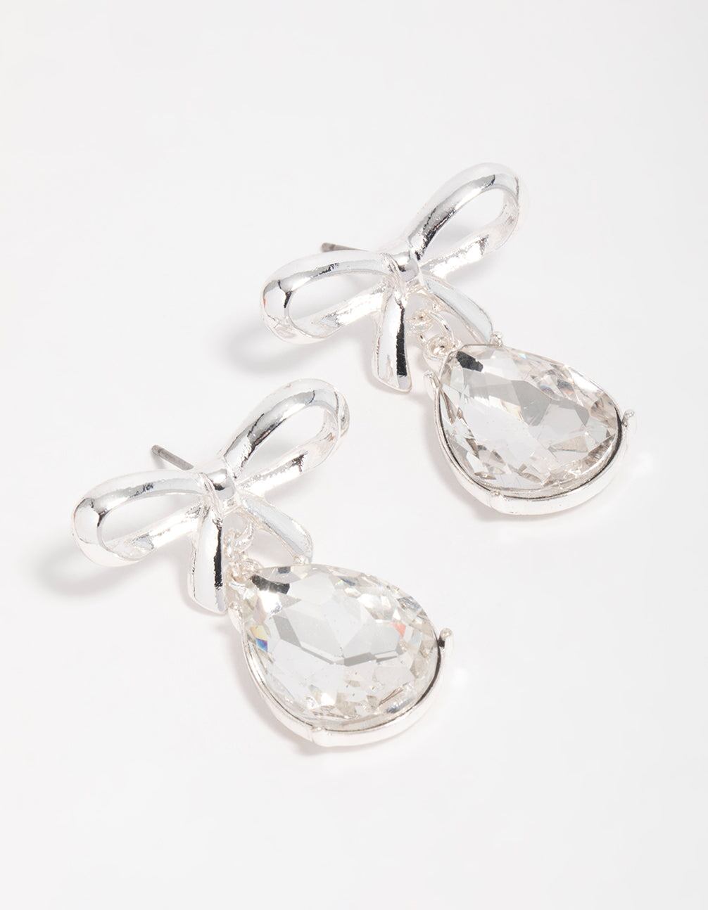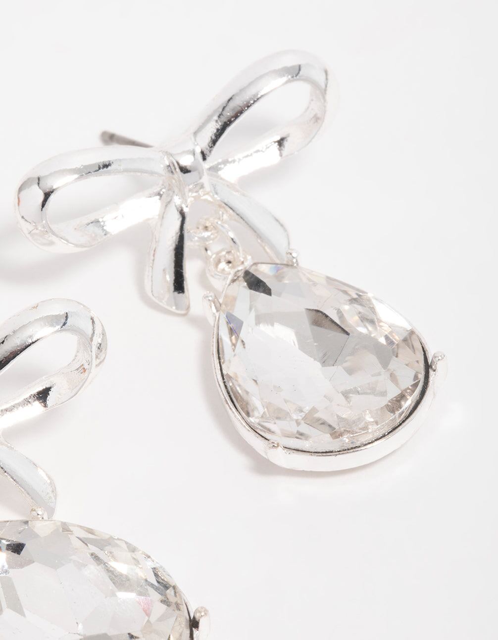 Silver Diamante Bow Drop Earrings