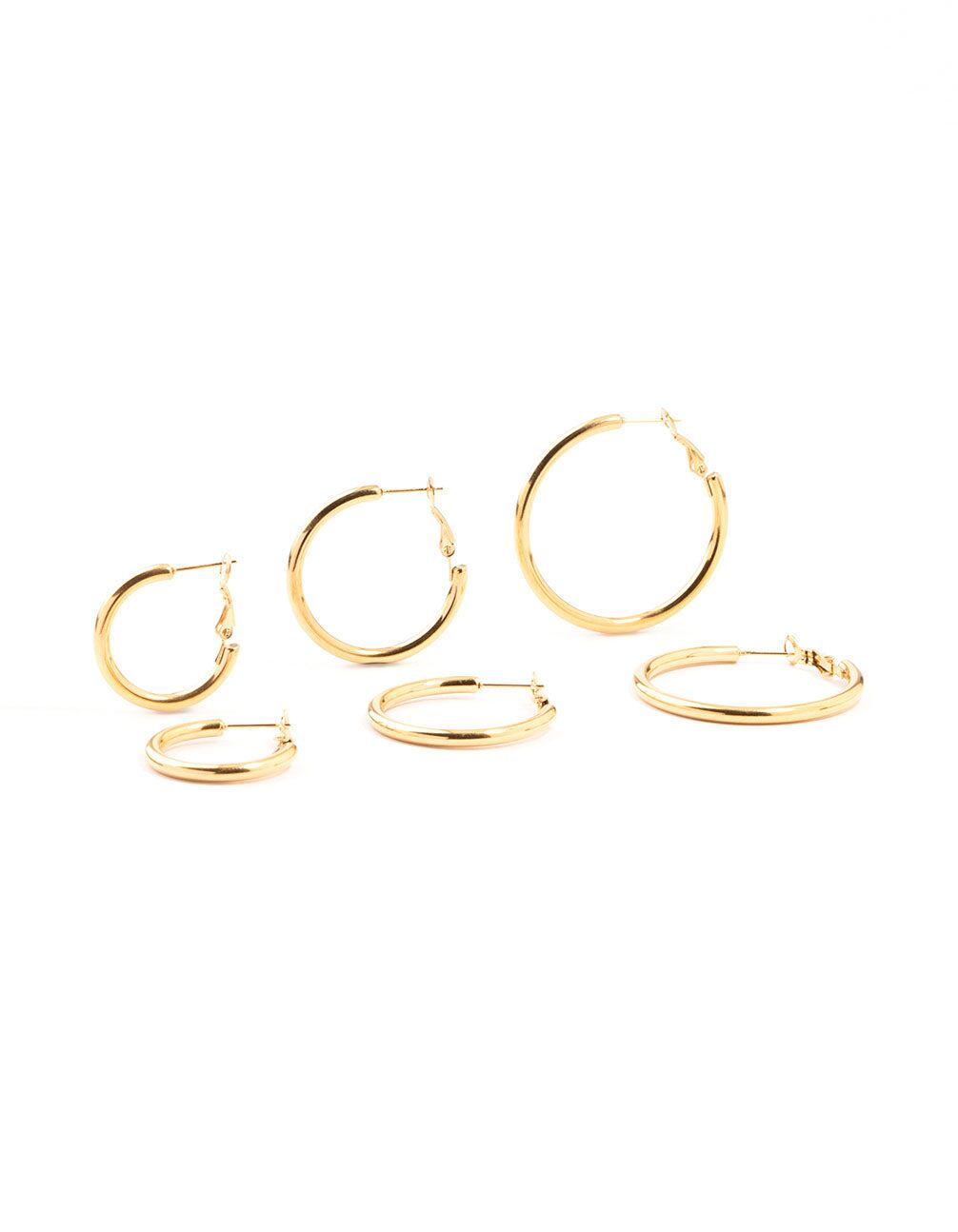 Waterproof Gold Plated Stainless Steel Large Basic Hoop Earrings 3-Pack