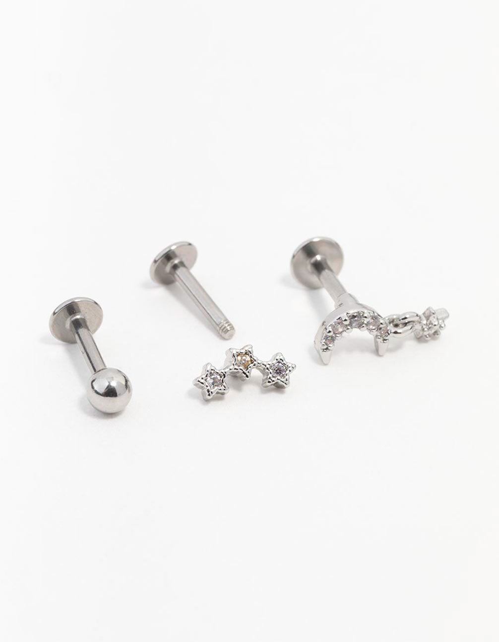 This set of three flat back surgical steel studs feature moon and star shapes to add celestial charm to your everyday jewelry collection. Wear these minimalist studs alone or mix and match with other flat back earrings for a personalized look.