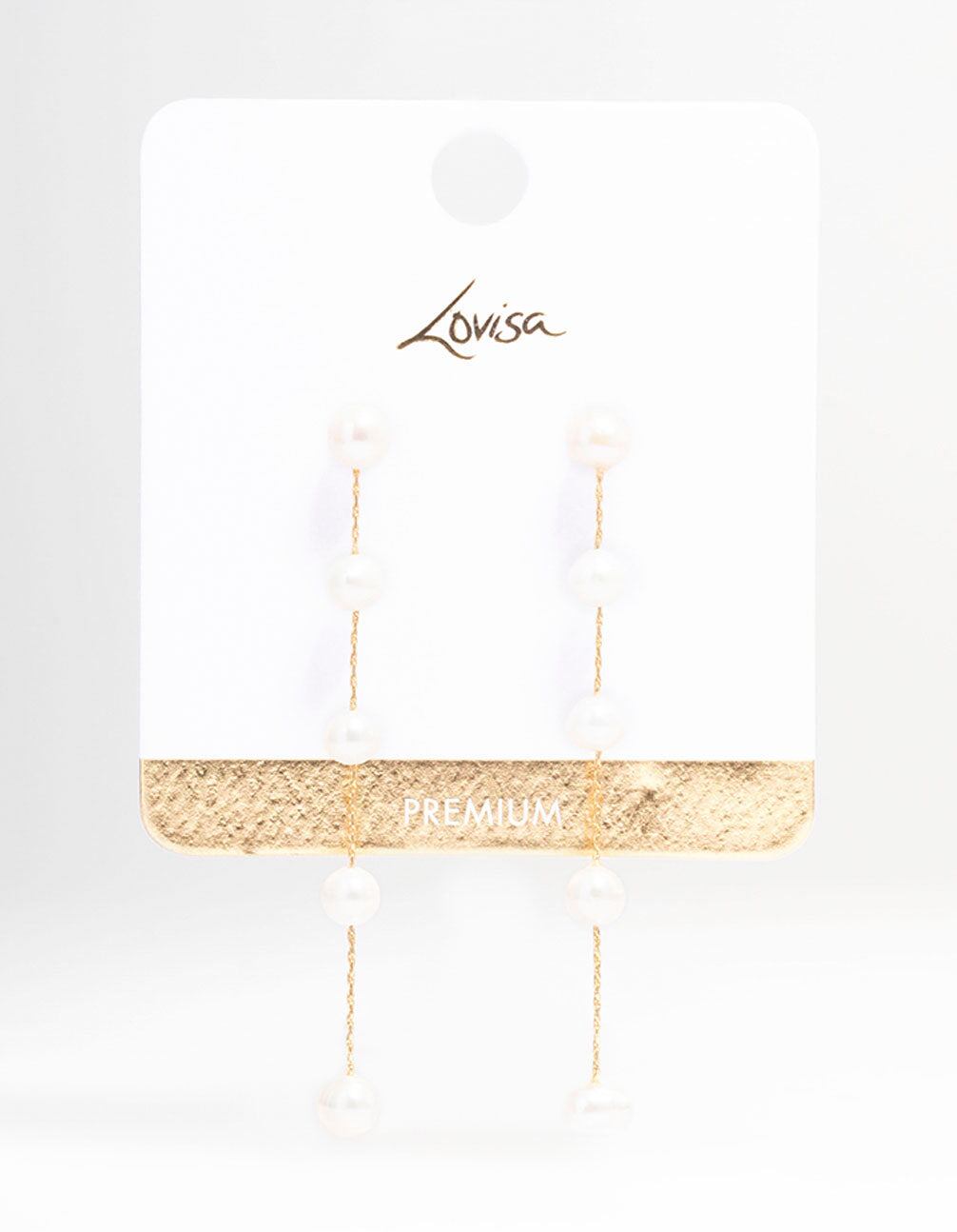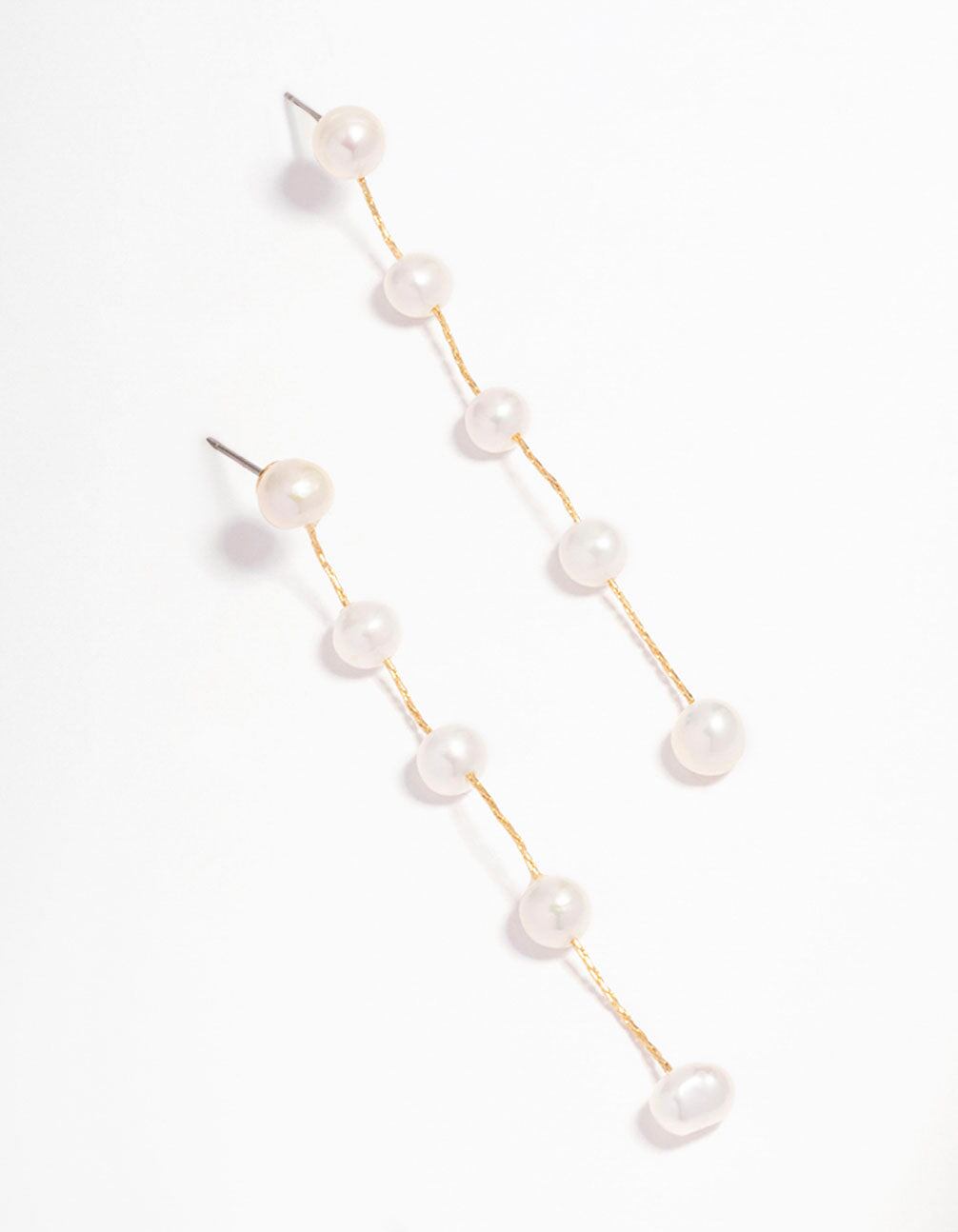 These drop earrings are plated with real gold and feature freshwater pearls that dangle for an elongated look.