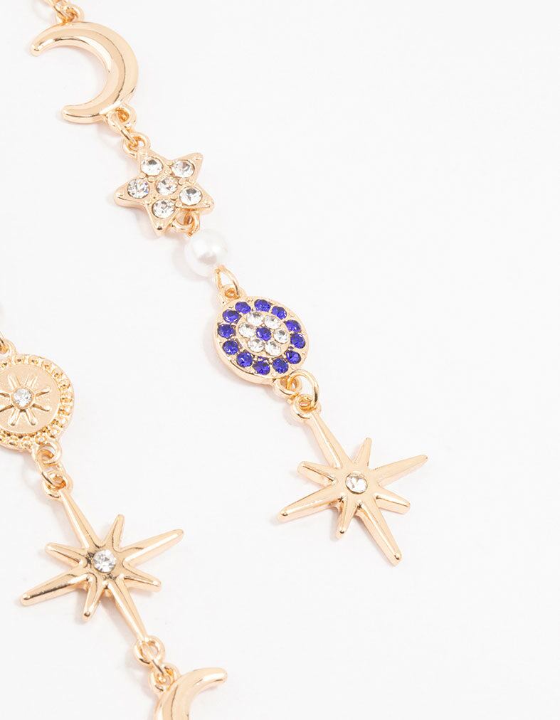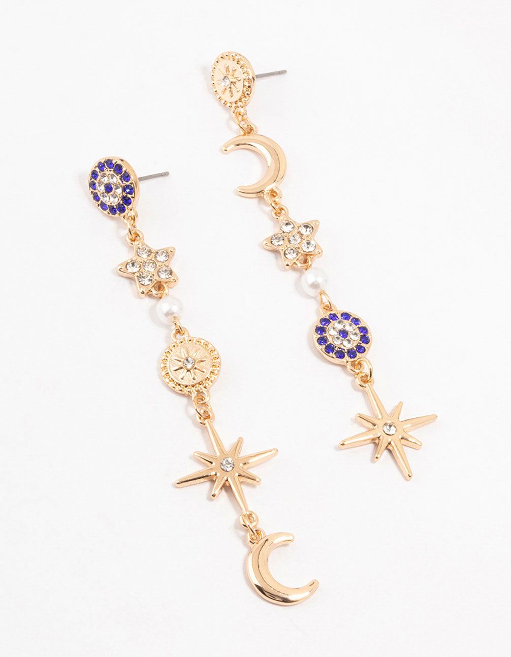 Dazzle with Gold Celestial Dark Blue Drop Earrings. These drop earrings feature rich. dark blue crystals. celestial motifs and an evil eye motif for good vibes and standout style. Perfect for adding a touch of vacay glamour to your beach looks.
