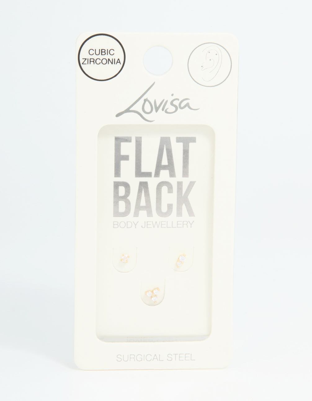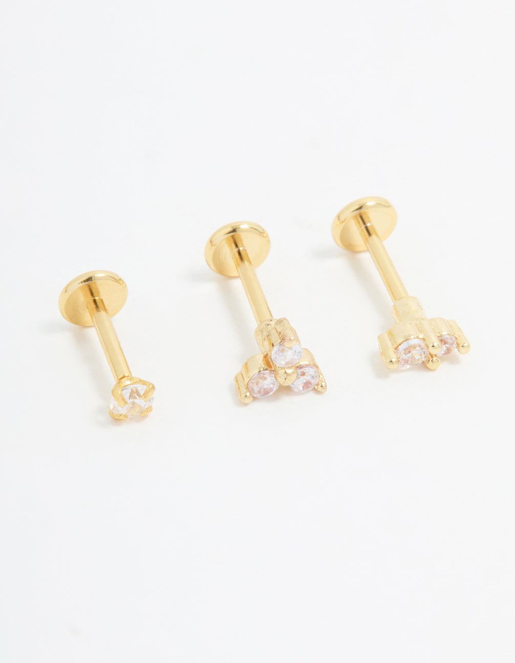 Gold Plated Surgical Steel Cubic Zirconia Round Flat Back Studs 3-Pack