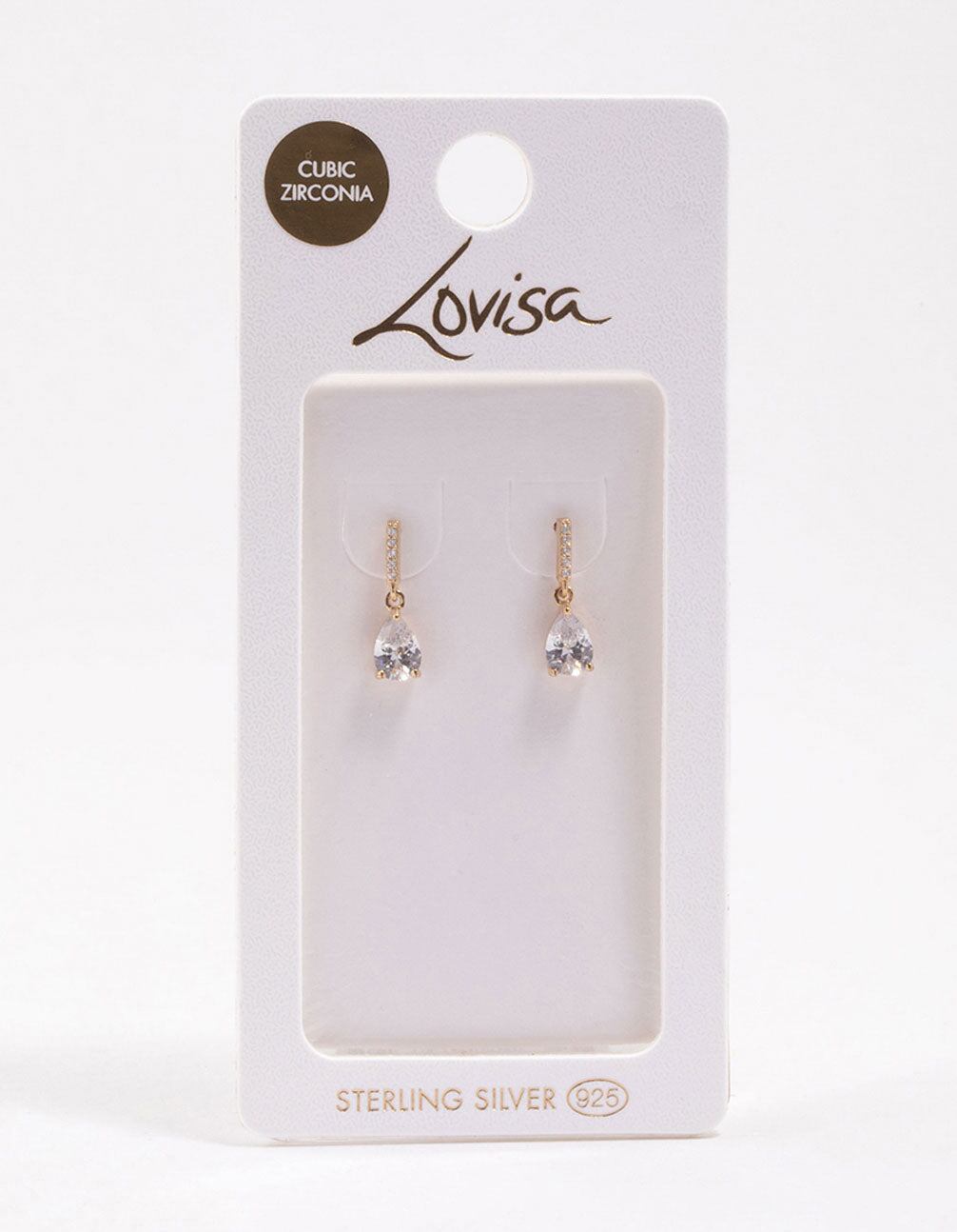 Material: Cubic Zirconia. Gold PlatedMaterial: Gold plated sterling silverBenefits: Perfect for everyday wearFeature: Teardrop cubic zirconia crystalsDesign: Drop earrings