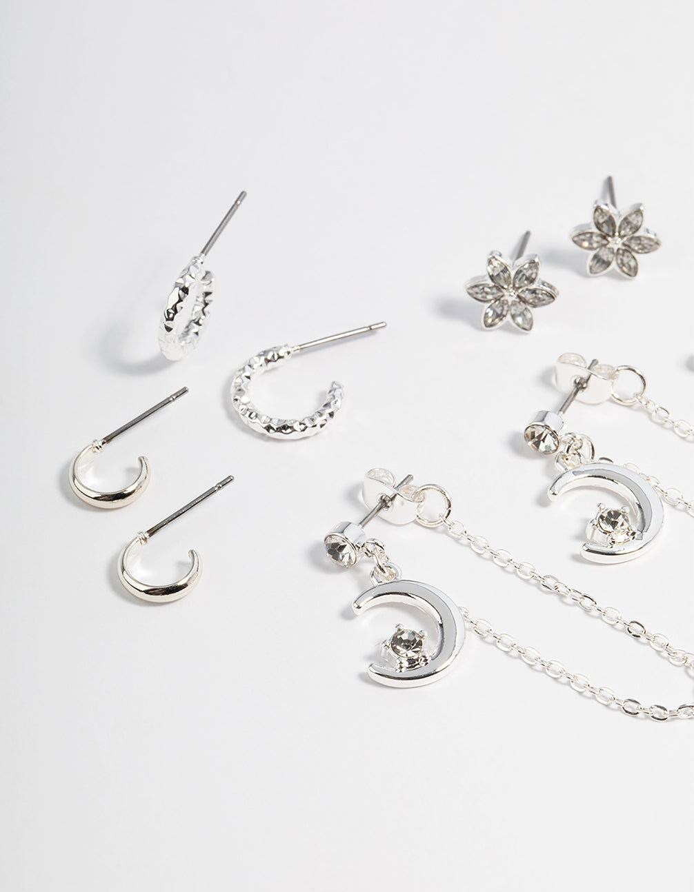 Treat yourself to some ear candy from our Curated Collection! Style this assorted pack of silver-toned. celestial themed hoops. This pack includes five sets of earrings. perfect for versatile styling.
