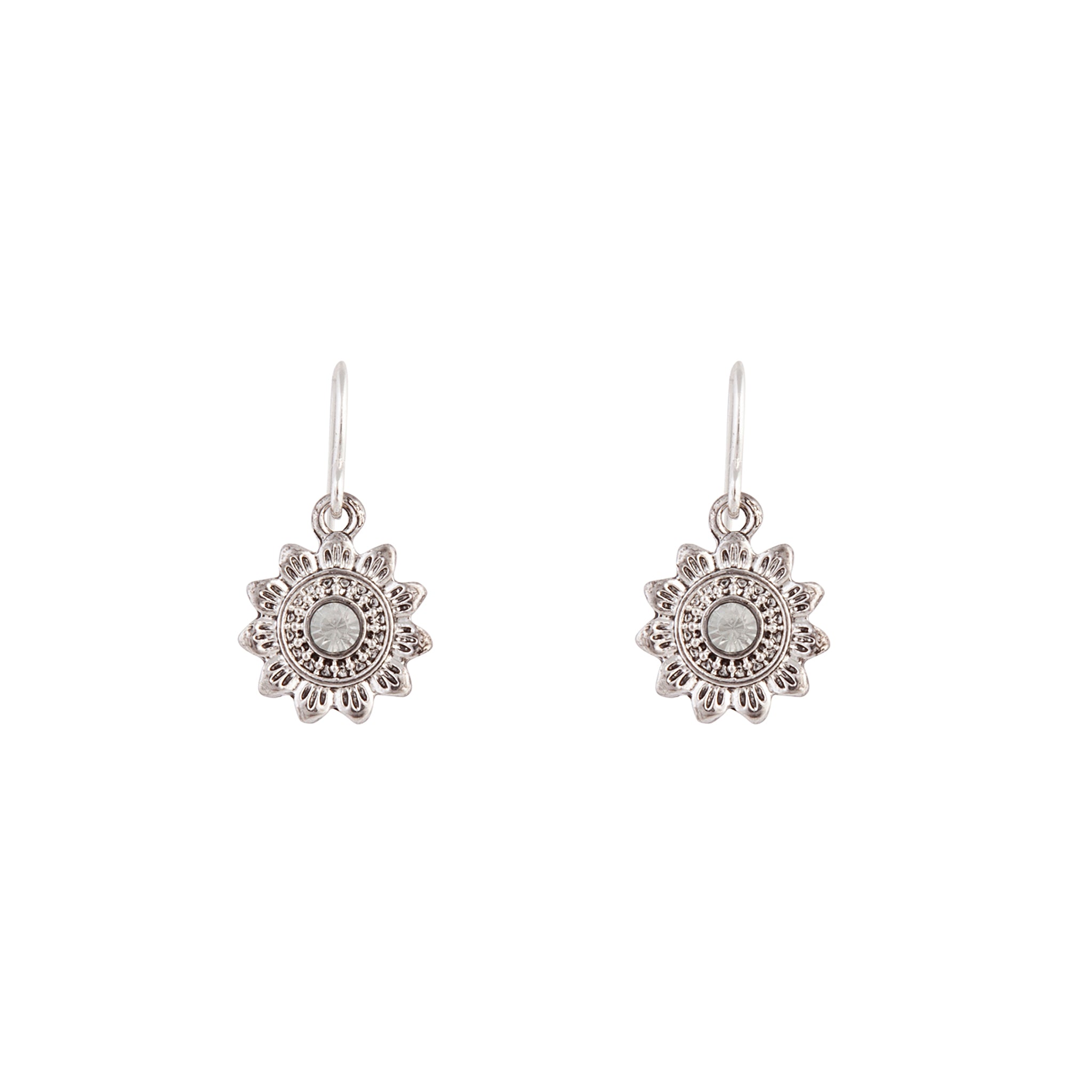 A pair of antique-silver-toned earrings with a subtle sun motif.
