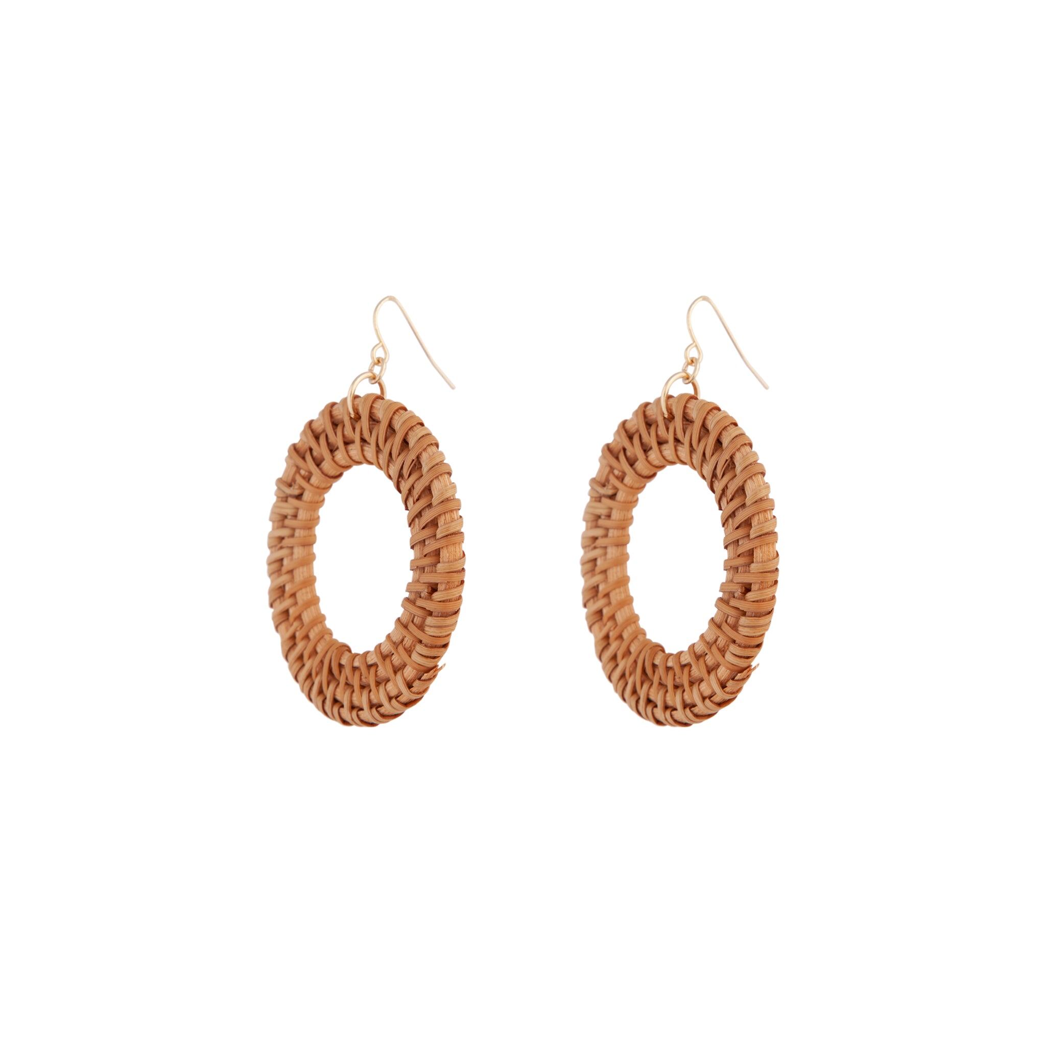 Embrace Summer with earthy and natural materials and tones. Rafia is a stunning material used for weaving traditional baskets and accessories. This pair of earrings feature a brown rafia circle drop design. Style with with semi-precious gems and woven accessories.