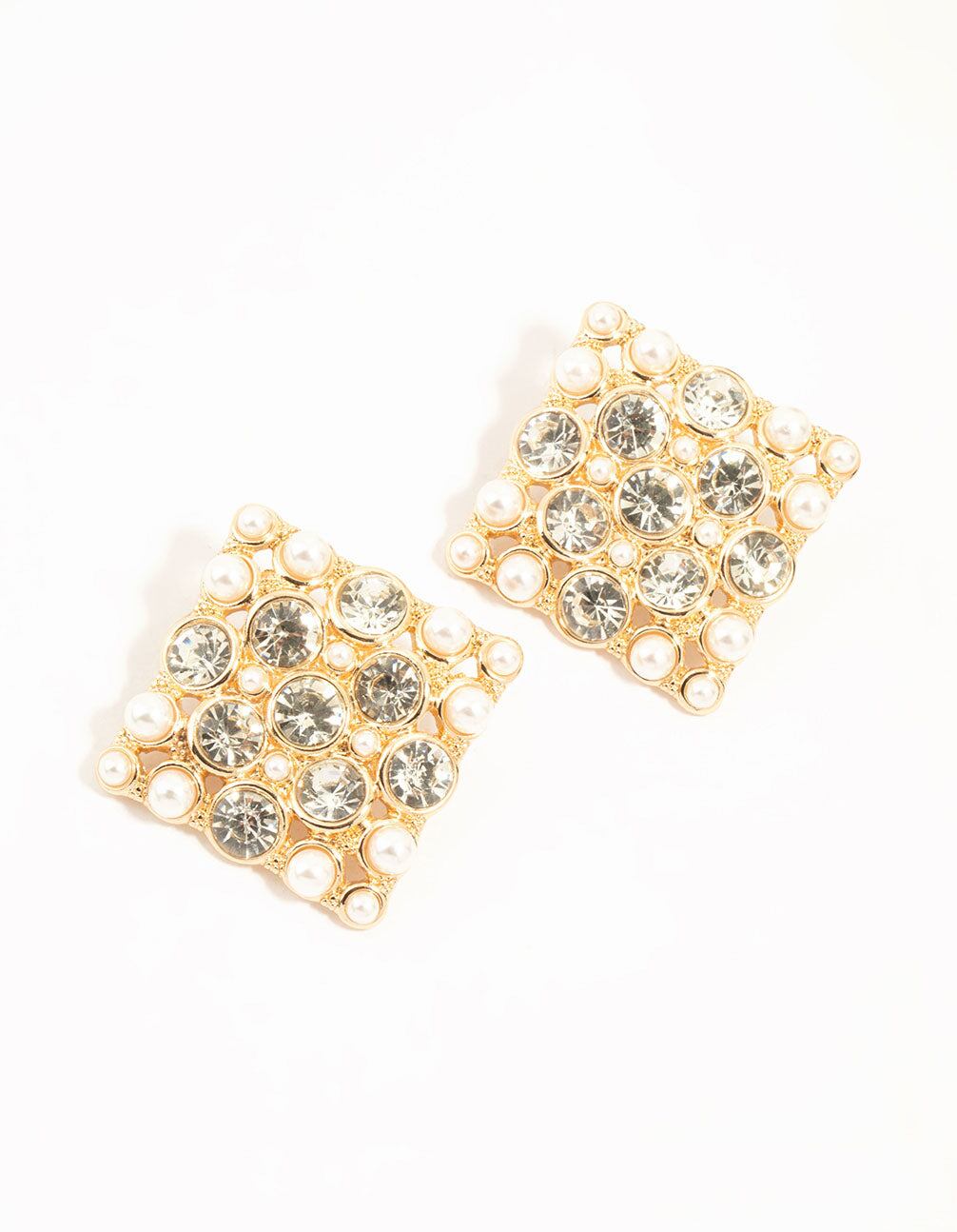 Gold Pearl & Diamante Square Stud Earrings