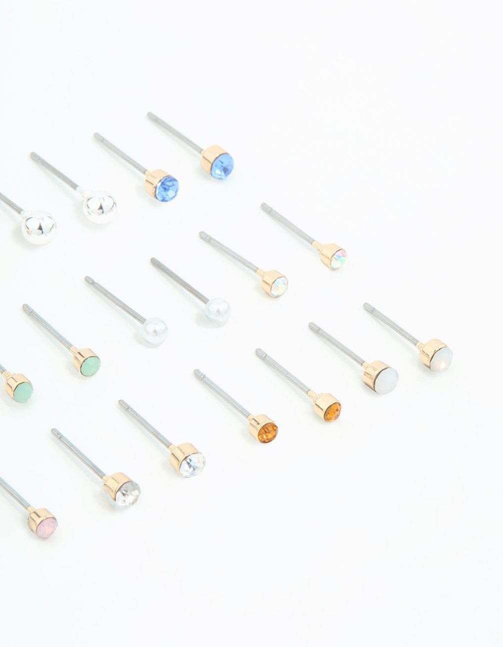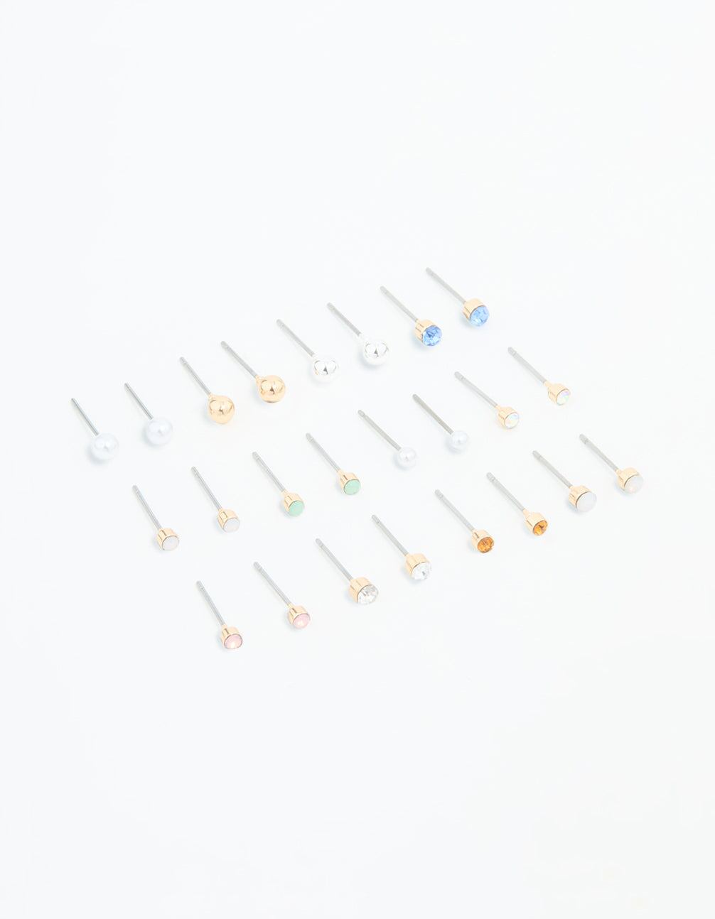 Upgrade your look with this stunning gold-toned stud pack! Featuring 8 studs including pearls. gold tones. and multicoloured diamantes for a minimalistic touch.