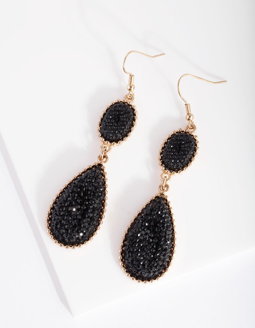 Statement earrings have become the easiest way to switch up any wardrobe. Conversation-starting styles mean that a new pair of earrings replaces the need for a new dress. Elevate your evening ensemble with these black and gold toned teardrop earrings. Style with bold rings. sleek hair and a bold lip for a dramatic look.
