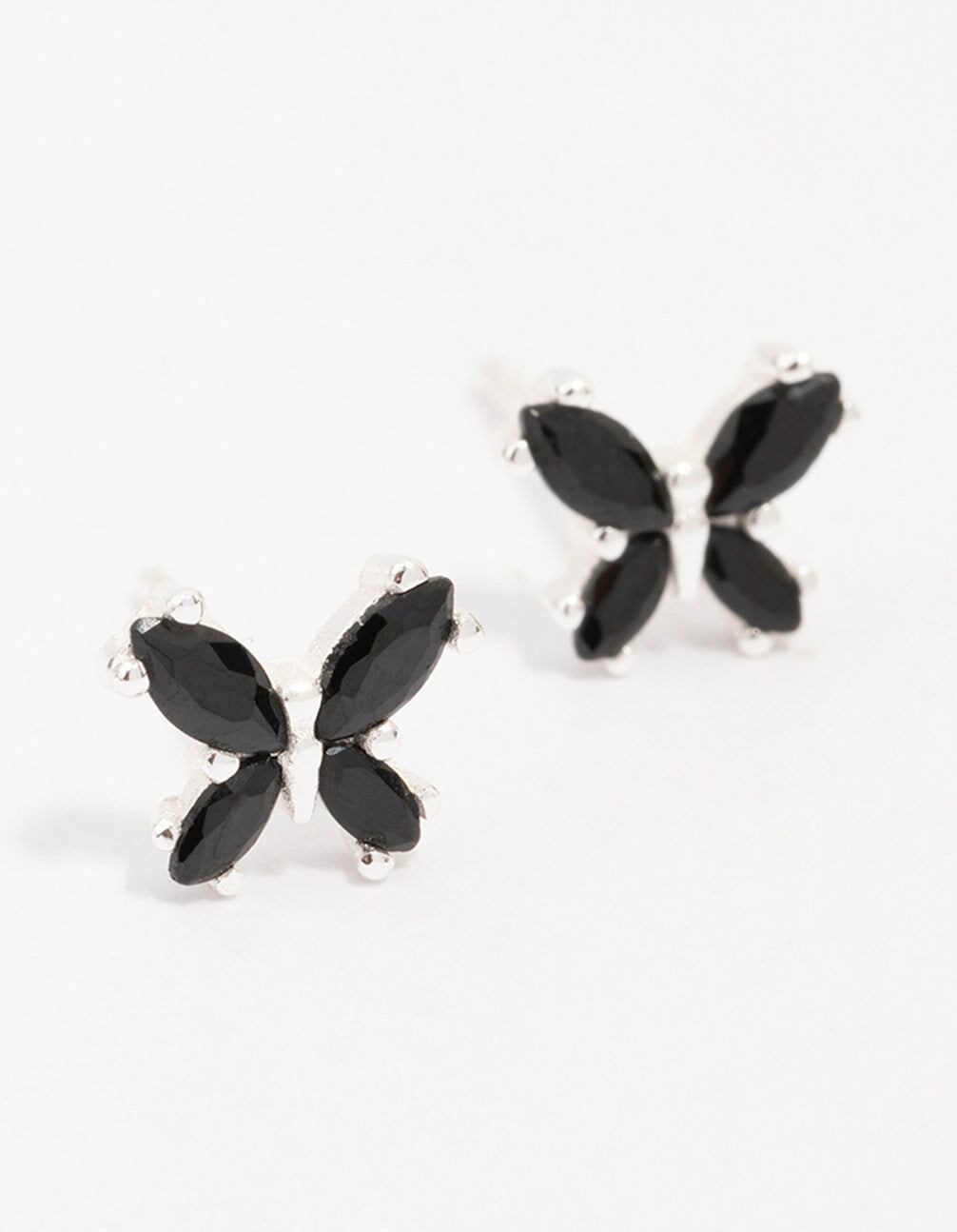 These classic stud earrings feature a mini butterfly design. adorned with black crystals for a glamorous touch.