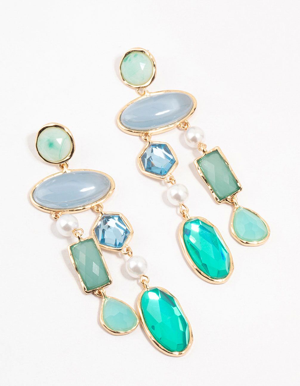 Dive into the depths of oceanic allure with these Large Multirow Blue Stones Drop Earrings. These earrings feature a captivating blend of aqua and light blue hued stones that evoking the different tones of the sea.