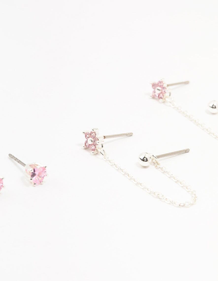 Silver Plated Brass Heart Flower Chain Earrings 3-Pack