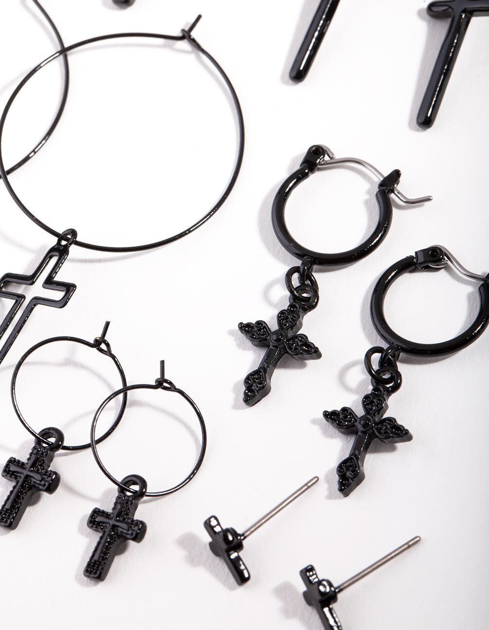 Can't decide on just one You don't have to! This style features a variety of earrings so you can mix and match to suit your mood. This pack comes with black-toned designs with a cross motif.