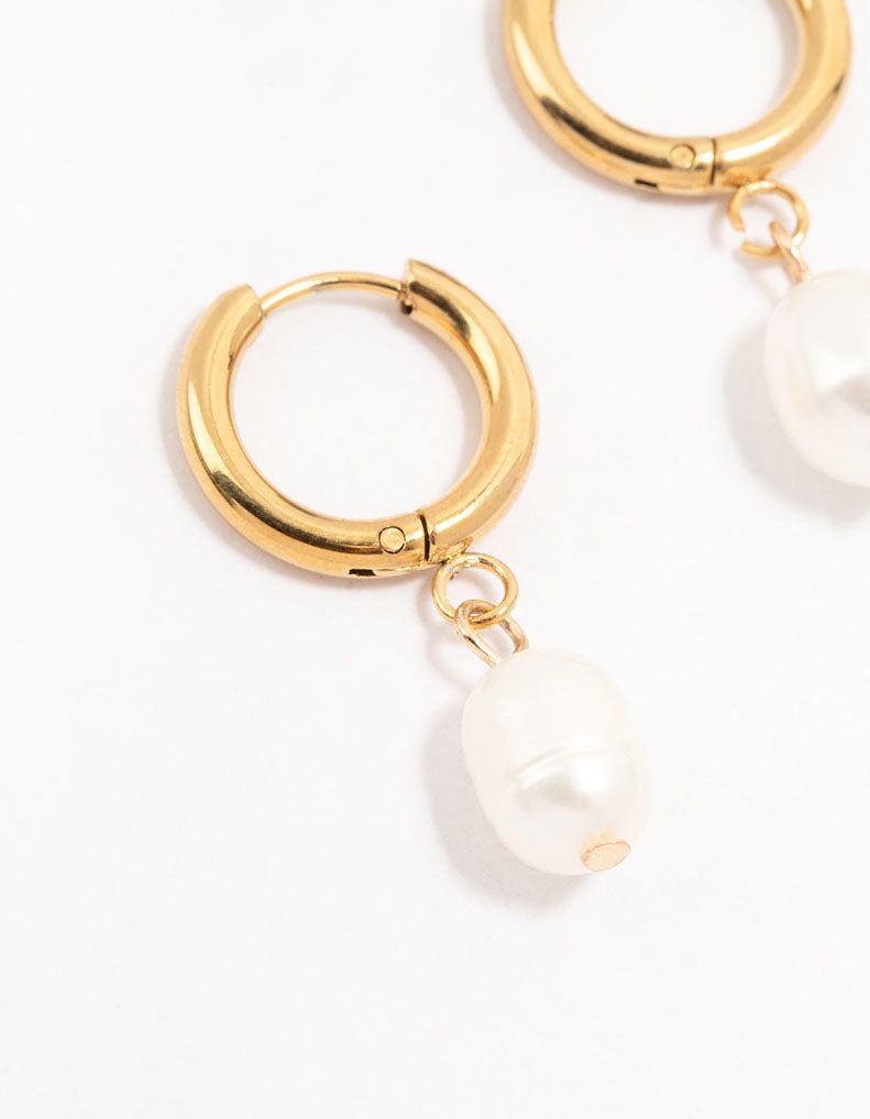 Waterproof Gold Plated Stainless Steel Freshwater Pearl Drop Huggie Earrings