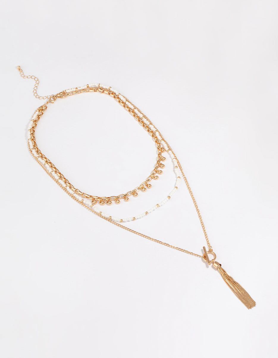 Channel boho vibes with this stunning gold-toned necklace! It features three layers: white and gold beads for fun. a tassel pendant for a statement. and chain links with gold beads for texture and style.