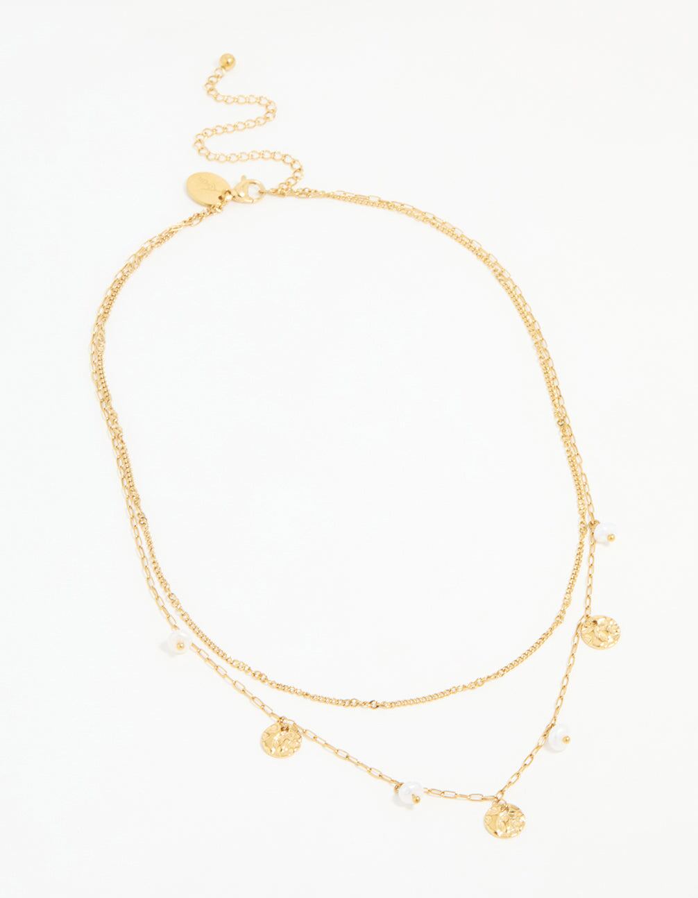 Waterproof Gold Plated Stainless Steel Pearl & Coin Layered Necklace