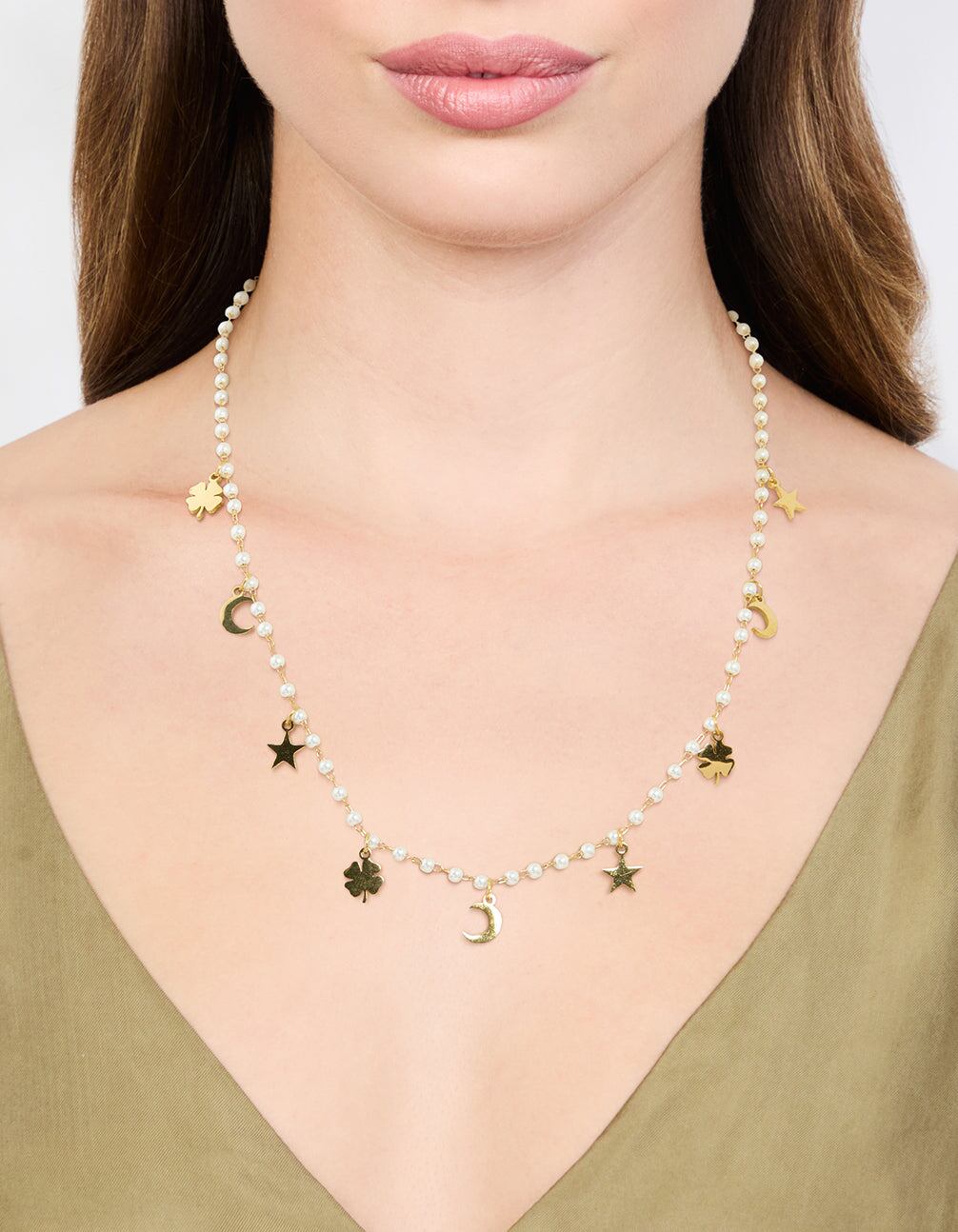 Add lucky charm to your look with this Waterproof Gold Plated Stainless Steel Clover Star & Moon Charm Necklace. This pendant necklace features delicate clover. star. and moon-shaped charms. all crafted in durable stainless steel with a luxe gold plating.