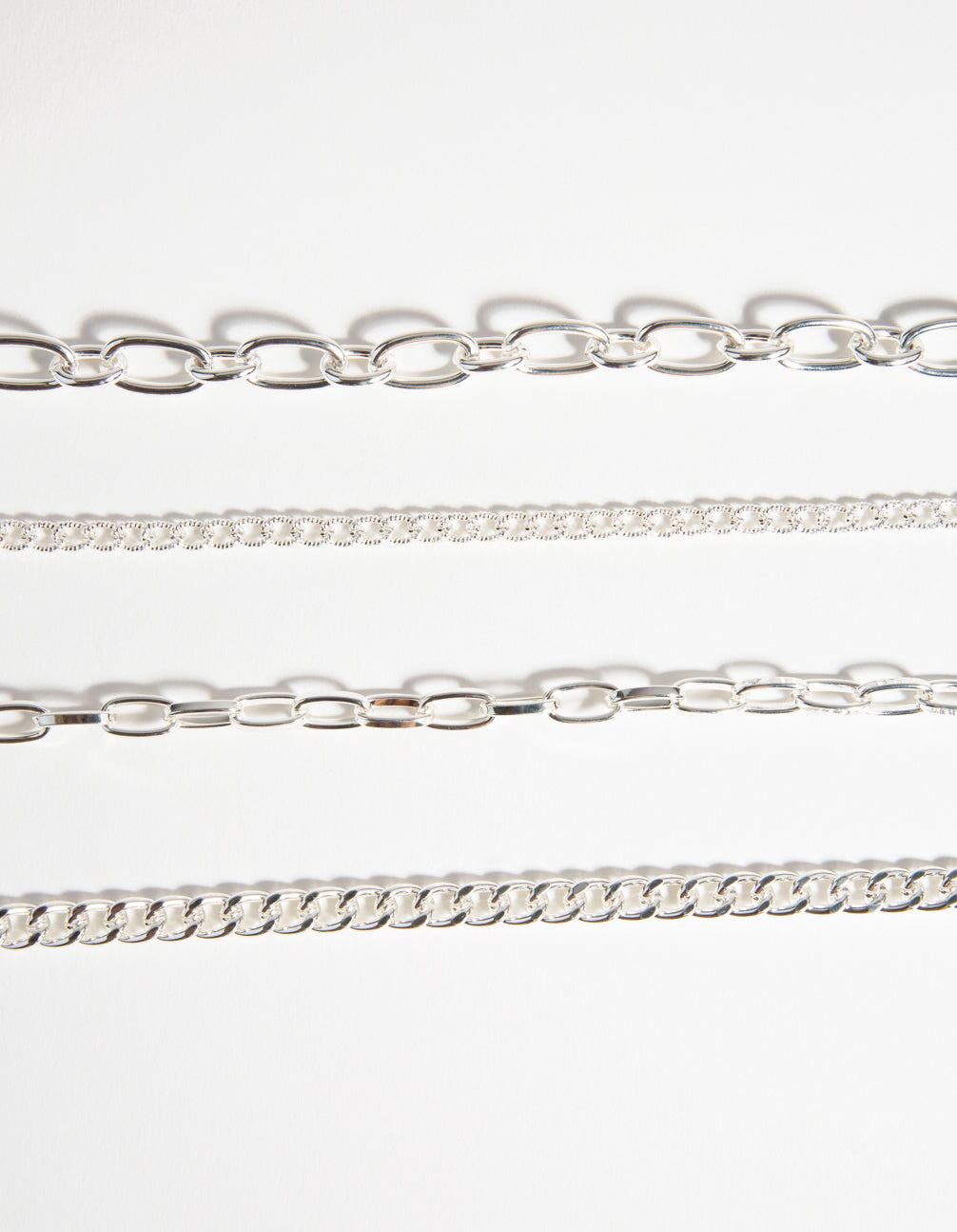 Layer it up with this 4-pack of choker necklaces. This set includes four silver-toned chains. varying from super chunky to delicate fine chains. Wear them all together for a bold. edgy look or just wear one to add some shine to your look.