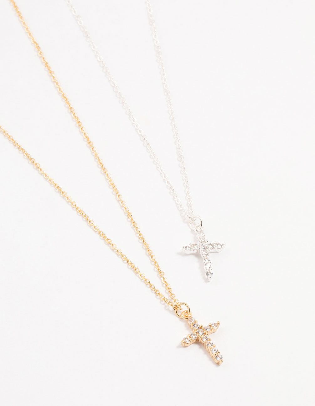 Embrace mixed metal chic with this set of two necklaces! Perfect for layering. they feature gold and silver plated cross pendants. adding a playful twist to your style and making great gifts.