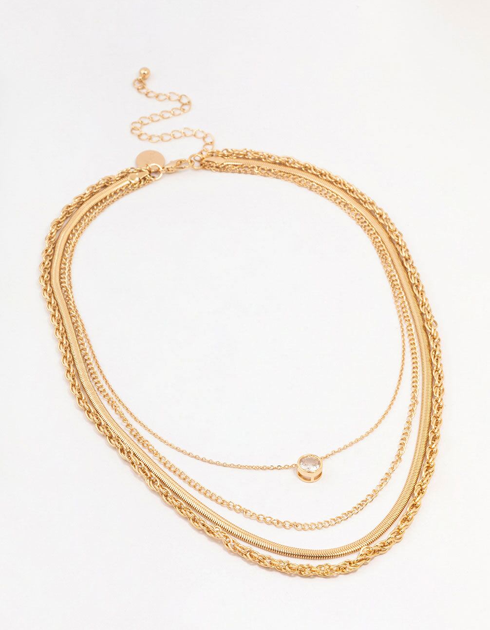 Get effortlessly stylish with this stunning multilayered gold chain necklace! Featuring a shimmery bezel-set cubic zirconia crystal and a mix of textured styles like snake chain and dainty chains. it adds fun and flair to any look.