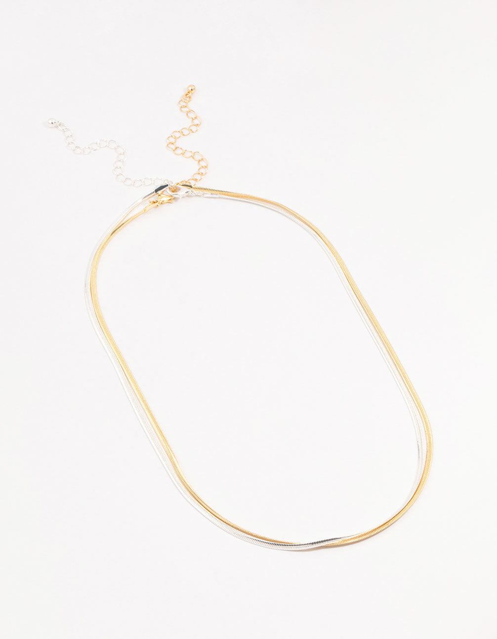 Achieve effortless cool with our mixed metals double chain necklace. This piece captures a clean and sophisticated aesthetic. ideal for a luxe finishing touch to your outfits. The gleaming gold and silver tones create a visually striking appearance.