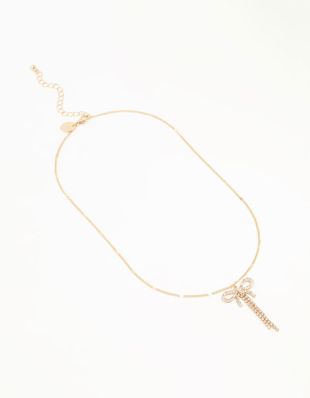 This stunning pendant necklace features a delicate bow design adorned with sparkling diamante crystals on a sleek gold-toned chain. Ideal for any occasion.