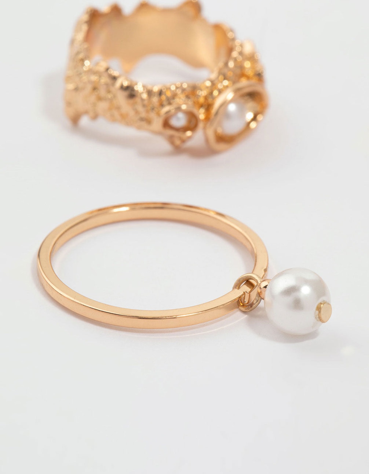 Upgrade your ring stack with this gorgeous gold-toned set! It features four styles: a chic pearl ring. a molten textured pearl ring. and two molten textured rings. Perfect for any look.