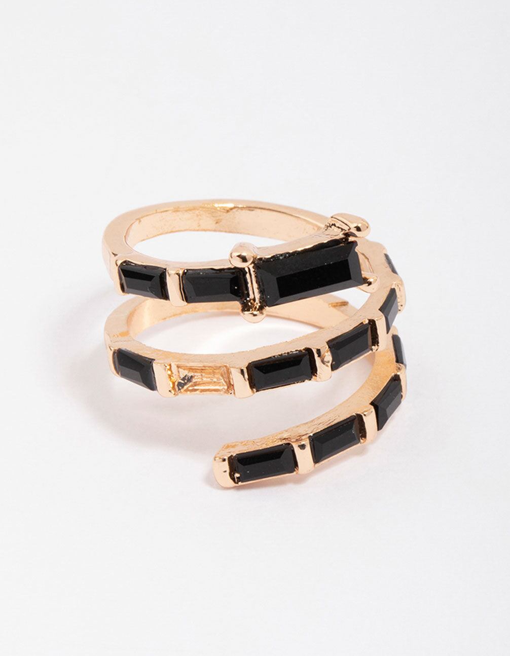 For a modern addition to your stack. style this gorgeous. gold-toned ring. This twisted statement ring features a spiral silhoutte. adorned with baguette-cut black crystals for a touch of drama.