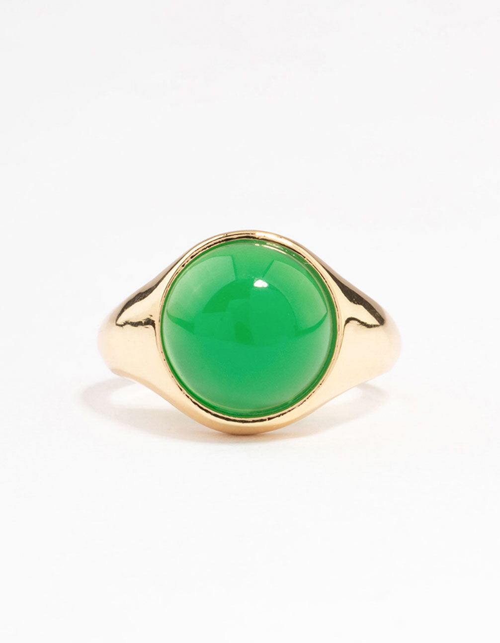 This eye-catching ring features a thick. gold plated band adorned with a round. green statement stone in the centre.