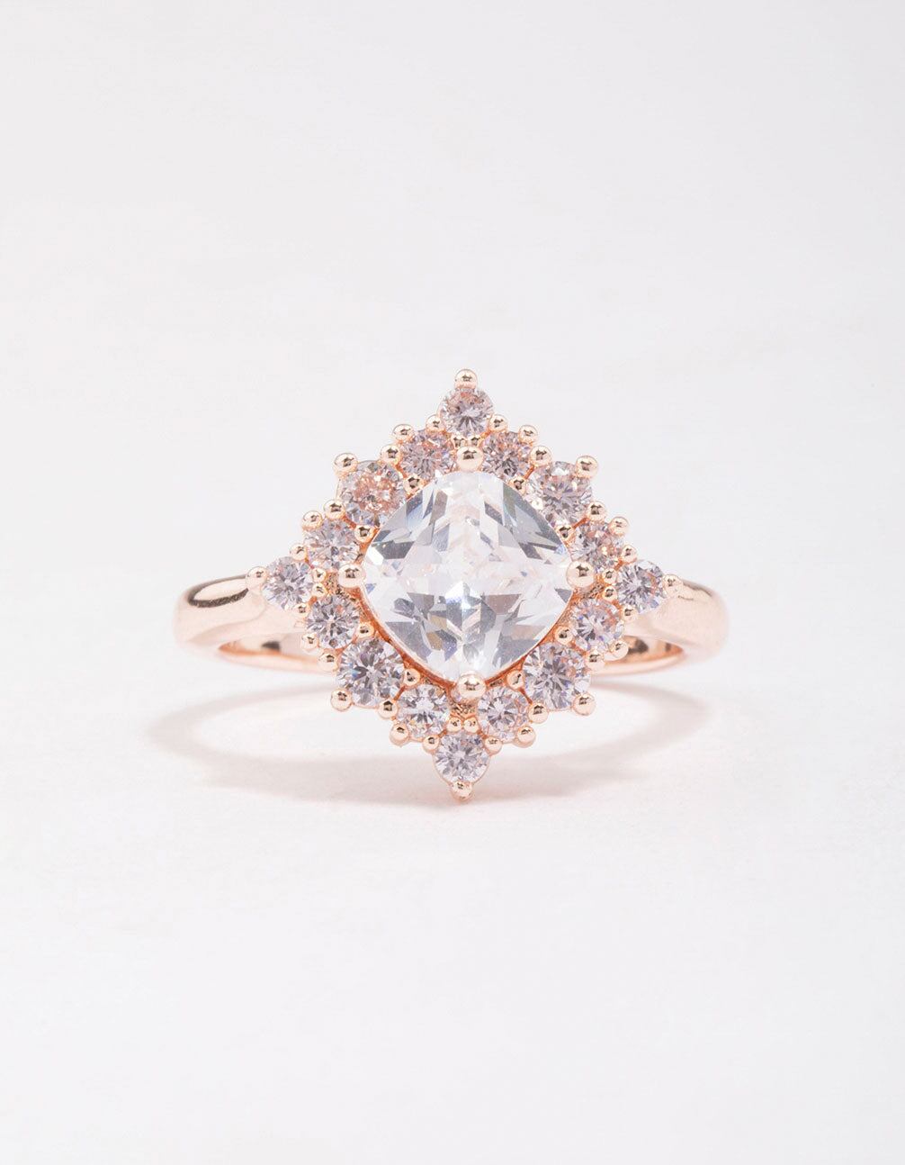 Spice up your stack with this stunning. rose gold cocktail ring. This engagement-style ring features a fine band. adorned with a framed cubic zirconia crystal in the centre.