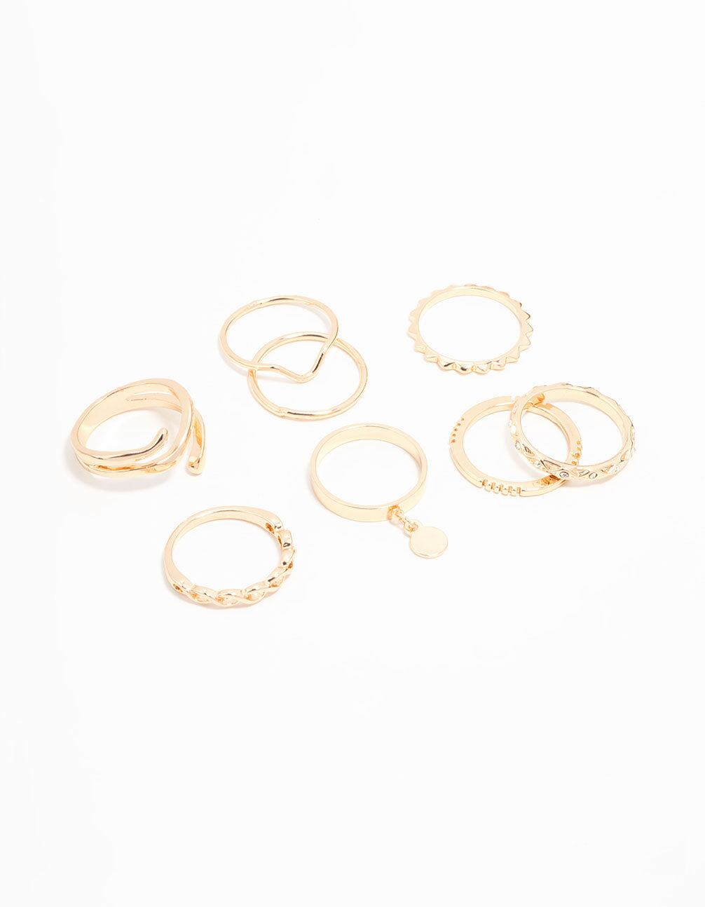Upgrade your ring game with this fabulous set of gold-toned stacking rings! Featuring 8 styles?twisted. wrap-around. and unique shapes?perfect for a fun. stacked look every time.