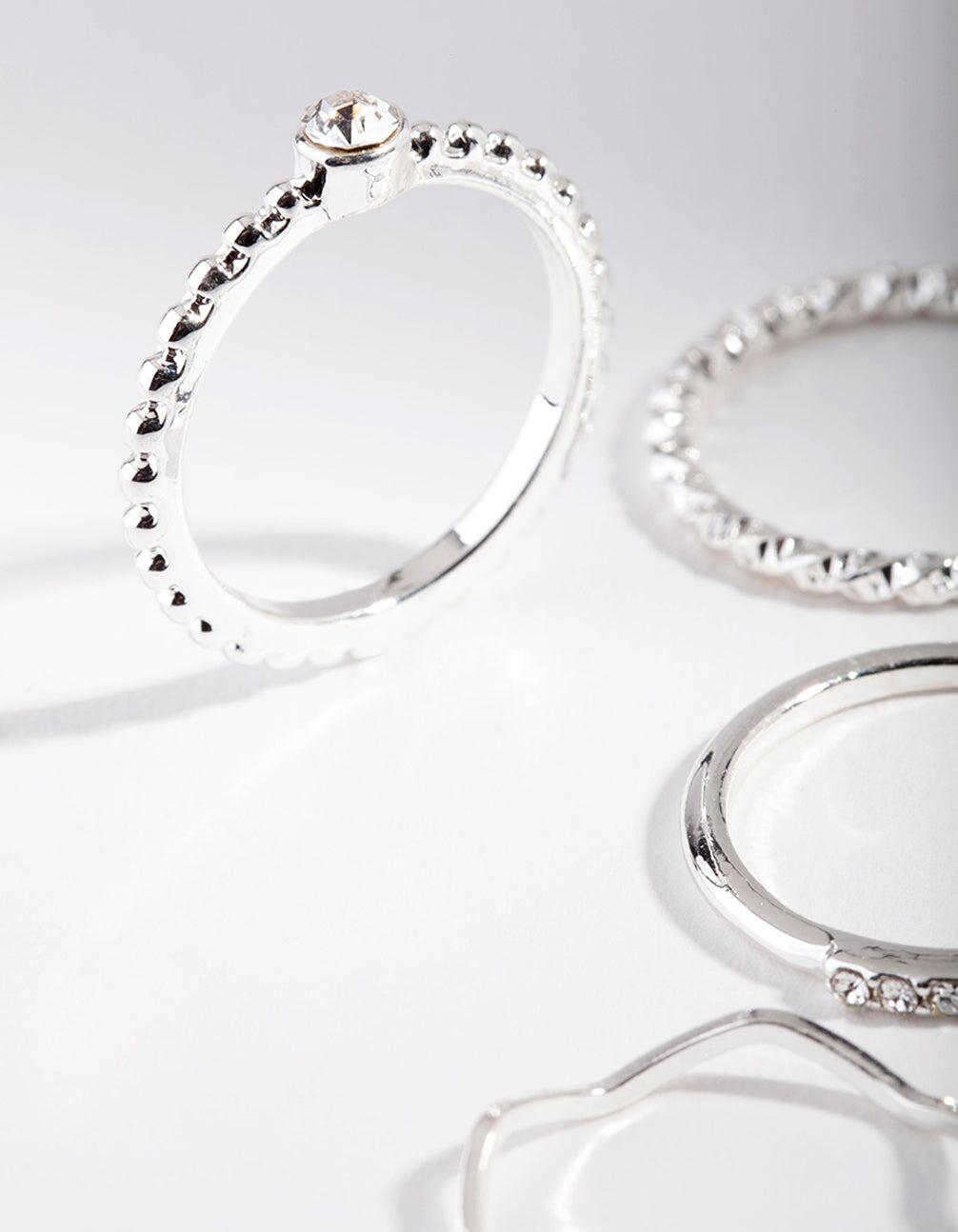 Mix and match with our ring packs! Stackable rings allow you to create your own personalised looks. This pack comes with a variety of silver-toned styles featuring stunning diamante embellished band designs.