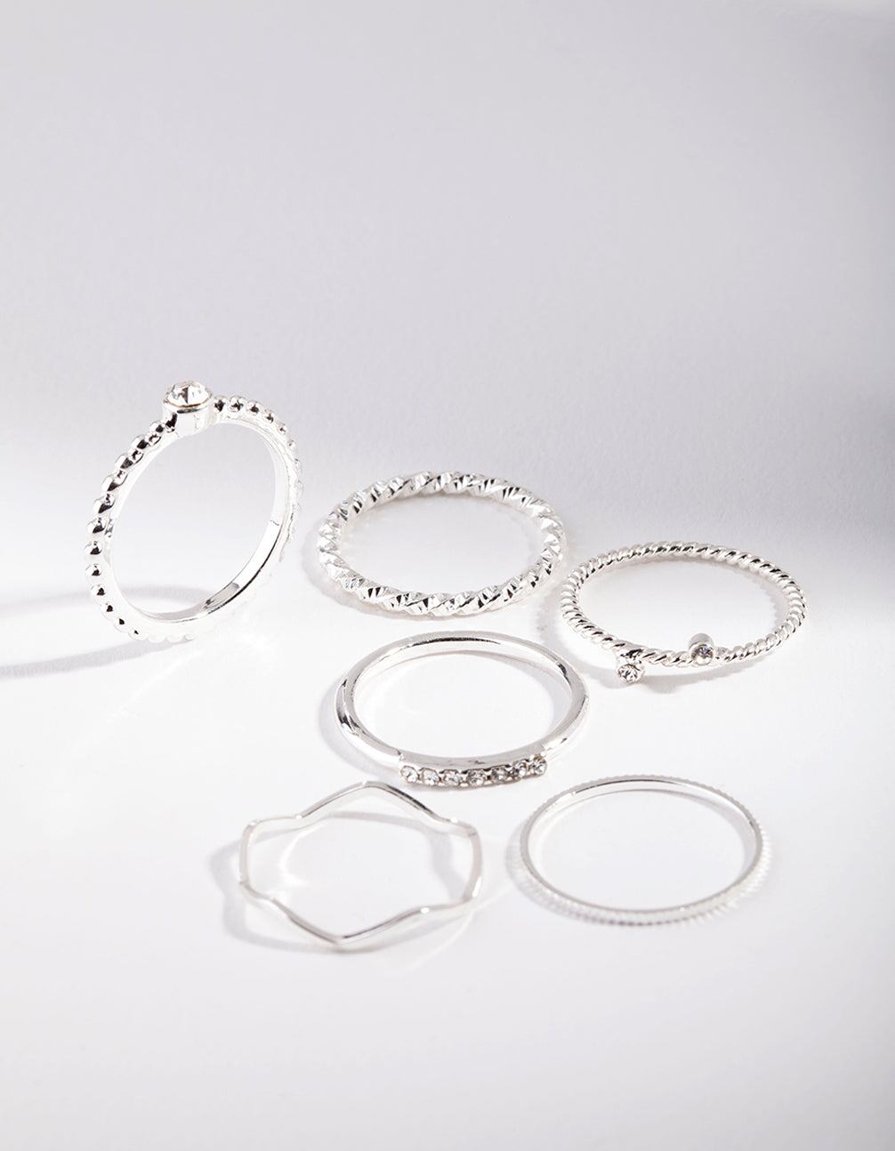 Silver Diamante Mixed Band Ring 6-Pack
